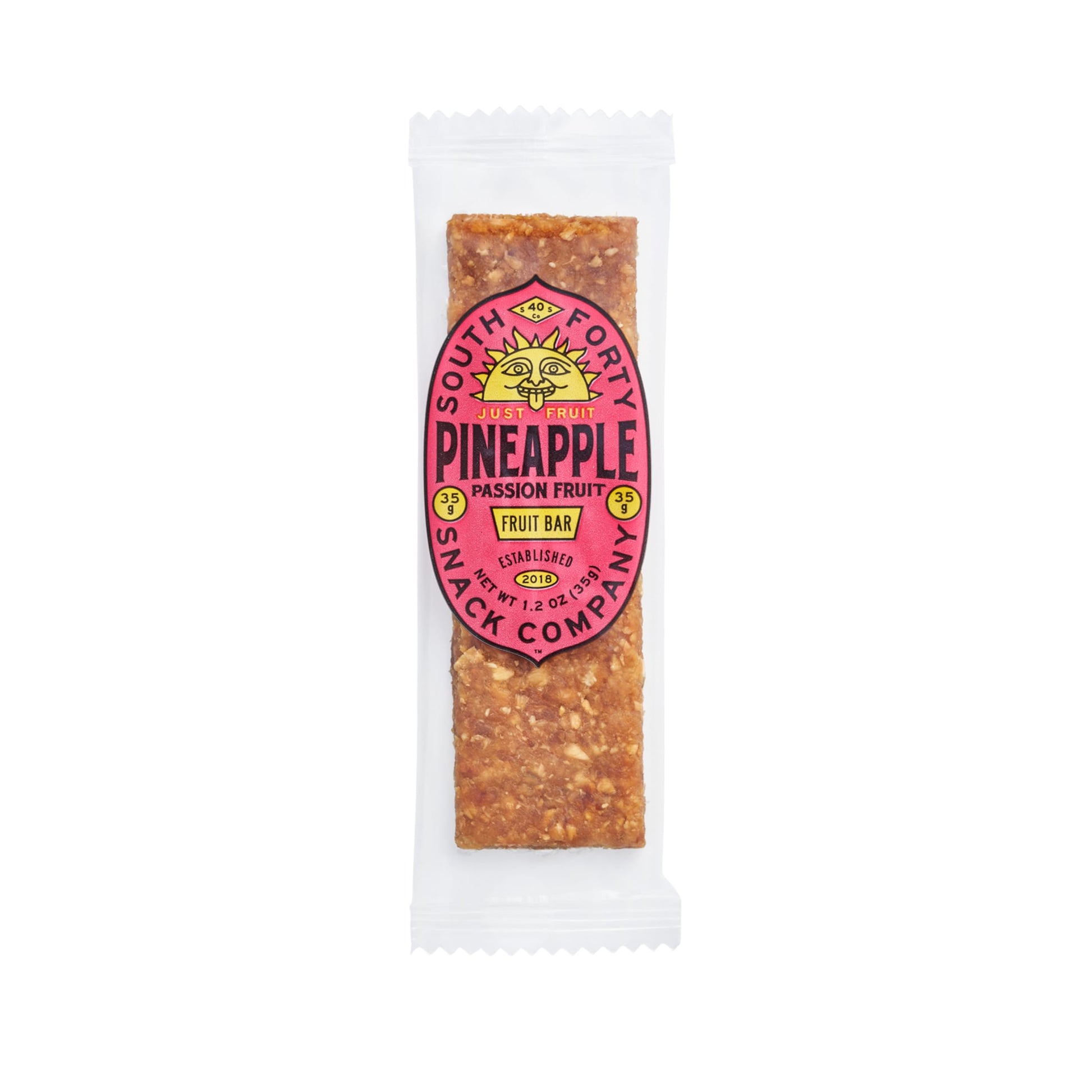 Q: What ingredients are in the South 40 Snacks Tropical Pineapple Passionfruit Fruit Bar?A: The South 40 Snacks Tropical Pineapple Passionfruit Fruit Bar contains just two ingredients: 96% pineapples and a small amount of passionfruit juice, making it a simple and healthy snack option.