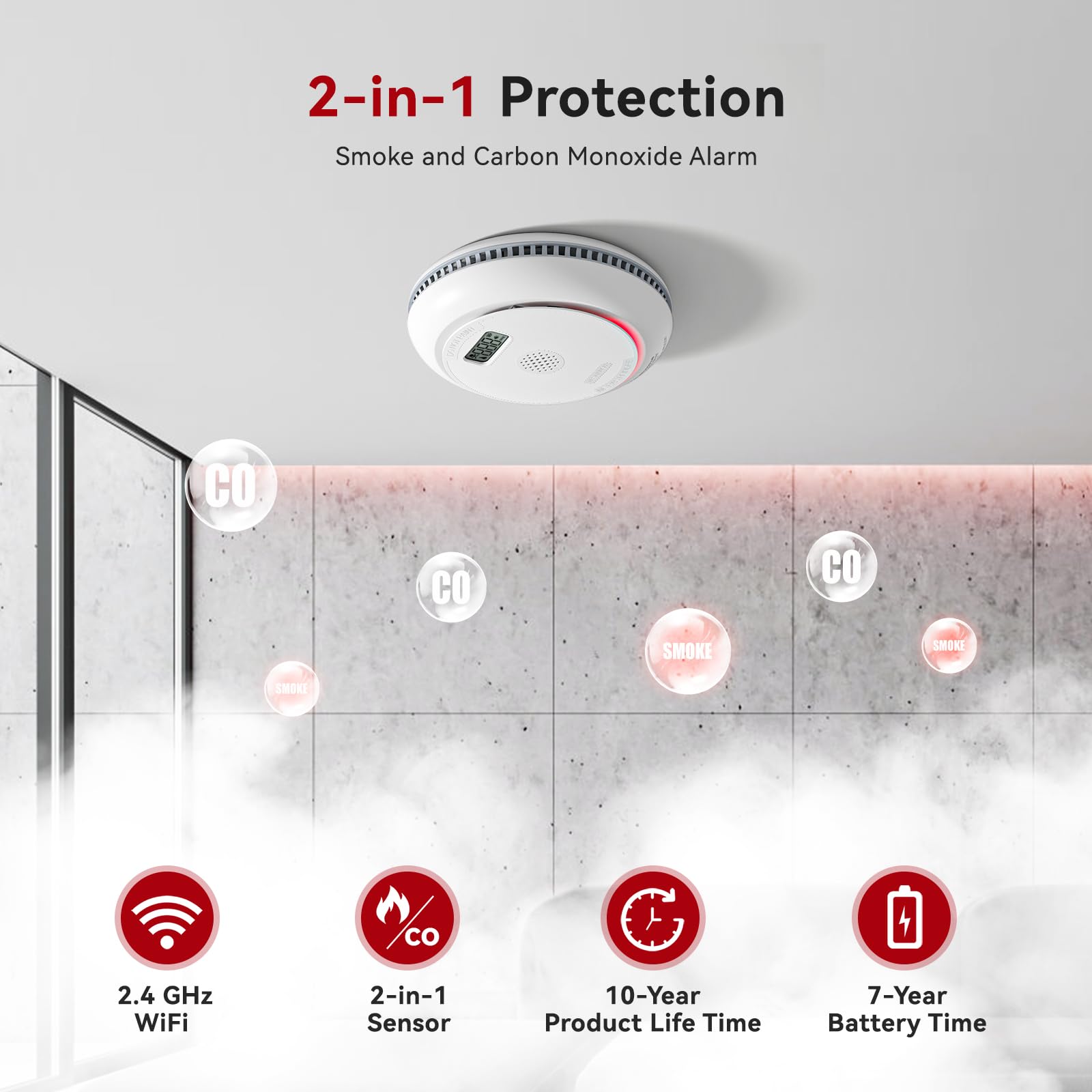 - Q: What features make this detector a 2-in-1 protection device? A: This device combines smoke and carbon monoxide detection using dual sensors, providing comprehensive protection against two types of hazards in one unit, complete with an audible alarm exceeding 85dB when danger is detected.