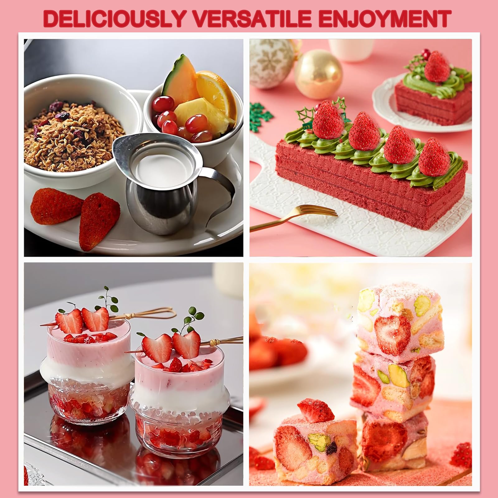 - Q: How can I use freeze dried strawberries in my recipes? A: Freeze dried strawberries can be used in various recipes, including yogurt, smoothies, baking, cocktails, and as toppings for cereals or desserts.