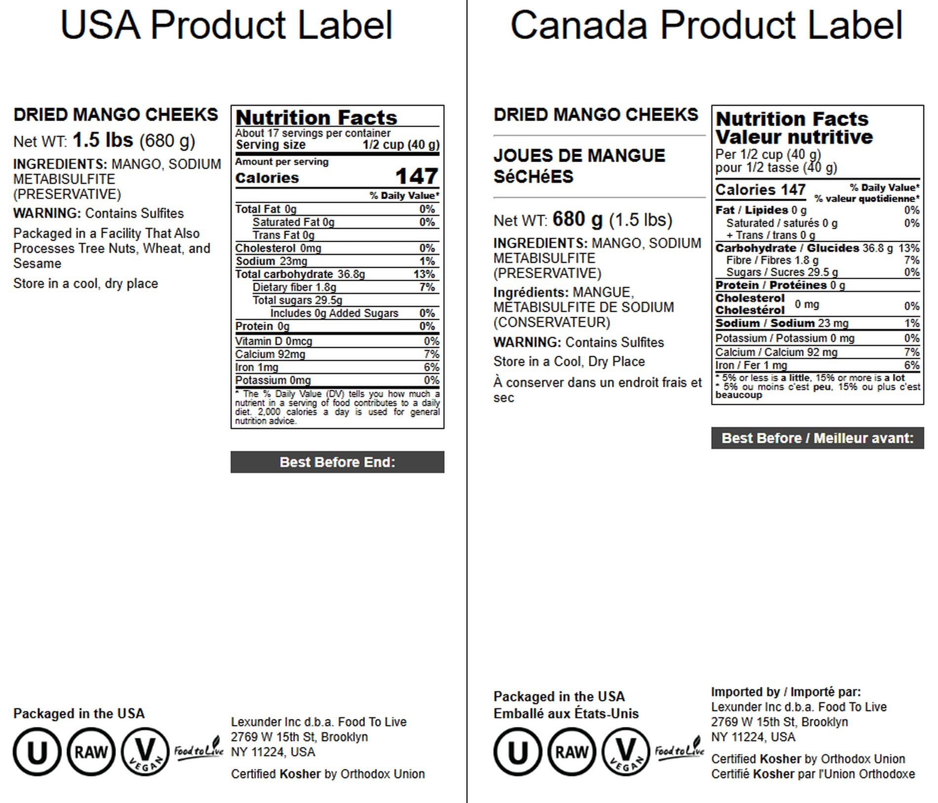 - Q: Do these dried mango cheeks have any allergens? A: Food to Live Dried Mango Cheeks do not contain common allergens like nuts or dairy. However, always check the packaging for specific allergen information.