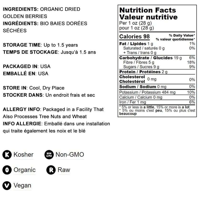 • Q: Do golden berries have any allergens or harmful ingredients? A: Food to Live Organic Golden Berries are free from common allergens and are processed in a facility that adheres to strict safety standards. They do not contain sulfites, making them a safe choice for individuals with sensitivities.