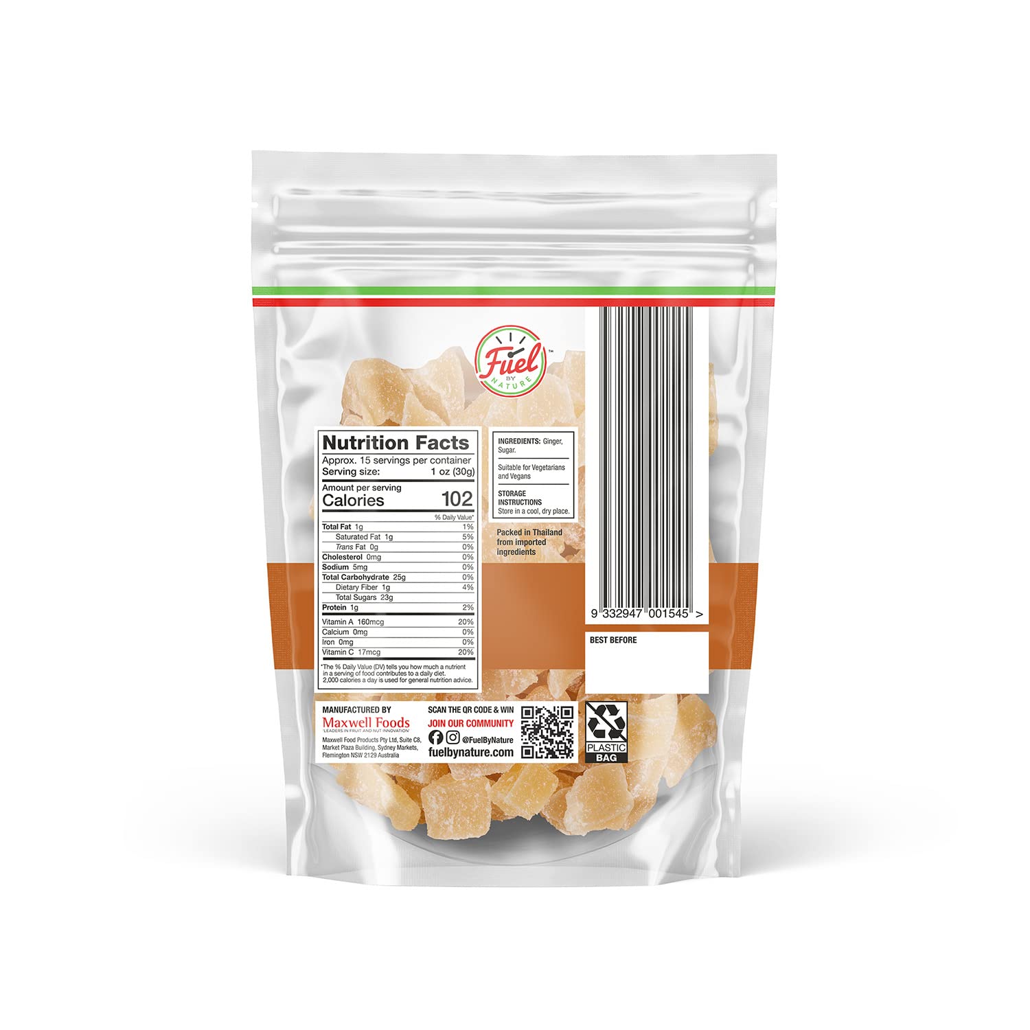 - Q: How long is the shelf life of this product? A: The shelf life of Fuel by Nature Dried & Crystallized Ginger is typically around twelve months when stored properly in a sealed bag in a cool, dry place.