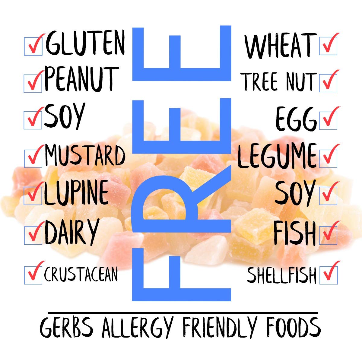 Gerbs Diced Tropical Fruit Mix includes bite-sized pieces of mango, papaya, and pineapple, gently dried to preserve their natural sweetness and chewy texture. This colorful, unsulfured mix is perfect for snacking or for adding to trail mixes, yogurt, cereals, or baked goods. Free from sulfur dioxide, preservatives, and the top 14 food allergens. Certified vegan and kosher, and packaged in Rhode Island using allergen-aware practices in food-grade, resealable bags.