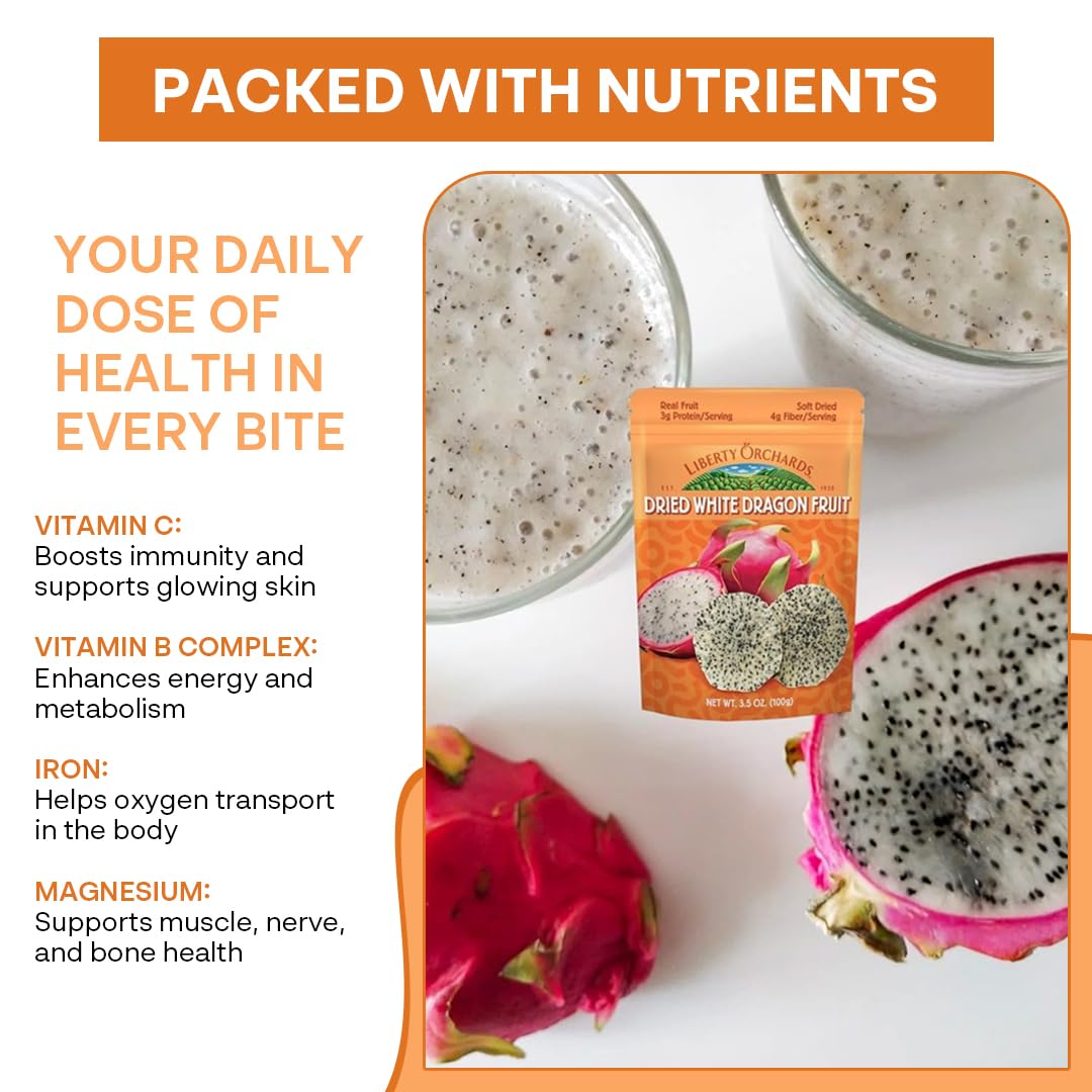 Introducing Liberty Orchard Organic Dried White Dragon Fruit Is A Delicious, Healthy Snack That Brings The Natural Sweetness Of Organic Fruit Straight To Your Fingertips. Carefully Dried To Perfection, Our Dried Dragon Fruit Offers The Ideal Balance Of Flavor And Nutrients. It&Rsquo; Free Dried Fruit Option That&Rsquo; S Both Tasty And Nutritious, Making It An Excellent Choice For Anyone Looking To Reduce Intake Without Sacrificing Flavor. Packed With Powerful Antioxidants And An Impressive Dose Of Vitamin C, Our Organic Fruit Is A Fantastic Way To Support A Healthy Immune System And Fight Off Free Radicals. Rich In Fiber, Our Snack Also Support Healthy Digestion And Helps Keep You Feeling Fuller For Longer.It&Rsquo; S The Ideal Choice For Anyone Looking For Healthy Snacks That Fit Seamlessly Into A Balanced Lifestyle. Whether You'Re At Work, Running Errands, Or Traveling, These Easy-To-Carry Dried Fruit Snack Packs Offer A Convenient Way To Enjoy A Wholesome, On-The-Go Snack. With Each Serving Providing The Goodness Of Dried Fruits , You Can Enjoy All The Natural Benefits Of Dragon Fruit Without The Guilt. For Those Who Enjoy Nourishing Their Body With Whole Foods, Our Natural Fruit Snack Is Packed With Essential Minerals Like Magnesium And Iron. Our Nutrients Help Support Energy Levels, Bone Health, And Muscle Function, Making This Dried Fruit An Excellent Choice For Active Individuals. Our Dried Dragon Fruit Also Delivers A Satisfying Crunch, Making It The Ideal Snack To Curb Hunger Without Reaching For Unhealthy Alternatives. If You'Re A Fan Of Creative Cooking, Our Organic Fruit Snack Is A Versatile Addition To Your Kitchen. Add It To Smoothies, Sprinkle It On Your Morning Oatmeal, Or Incorporate It Into Your Baked Goods For A Burst Of Natural Flavor And Color.