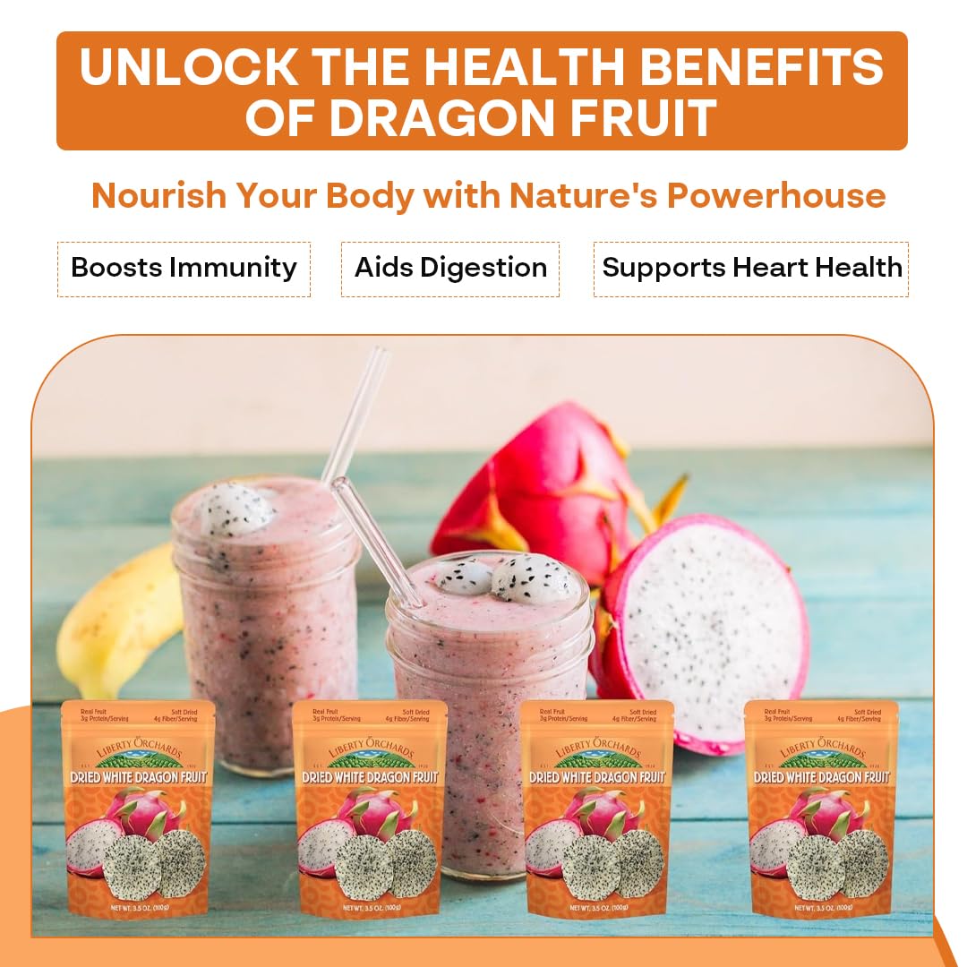 • Q: What are the health benefits of Liberty Orchard Organic Dried White Dragon Fruit? A: Liberty Orchard Organic Dried White Dragon Fruit is rich in vitamin C, antioxidants, and fiber, making it a nutritious snack that supports a healthy immune system, promotes digestion, and helps keep you feeling fuller for longer.