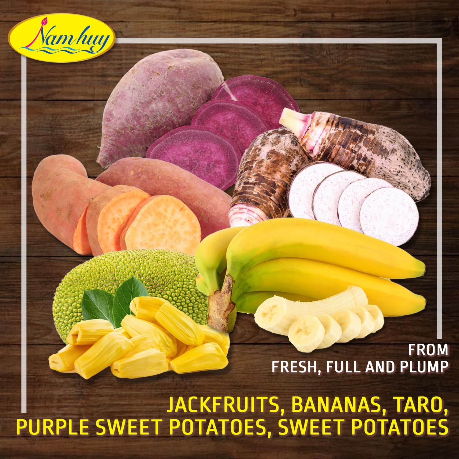 - Q: What ingredients are used in NAM HUY Dried Mixed Fruit Snacks? A: NAM HUY Dried Mixed Fruit Snacks are made from 99% pure Vietnamese fruits, including jackfruits, bananas, sweet potatoes, taro, and purple sweet potatoes. There are no added sugars, preservatives, or additives, ensuring a natural taste.