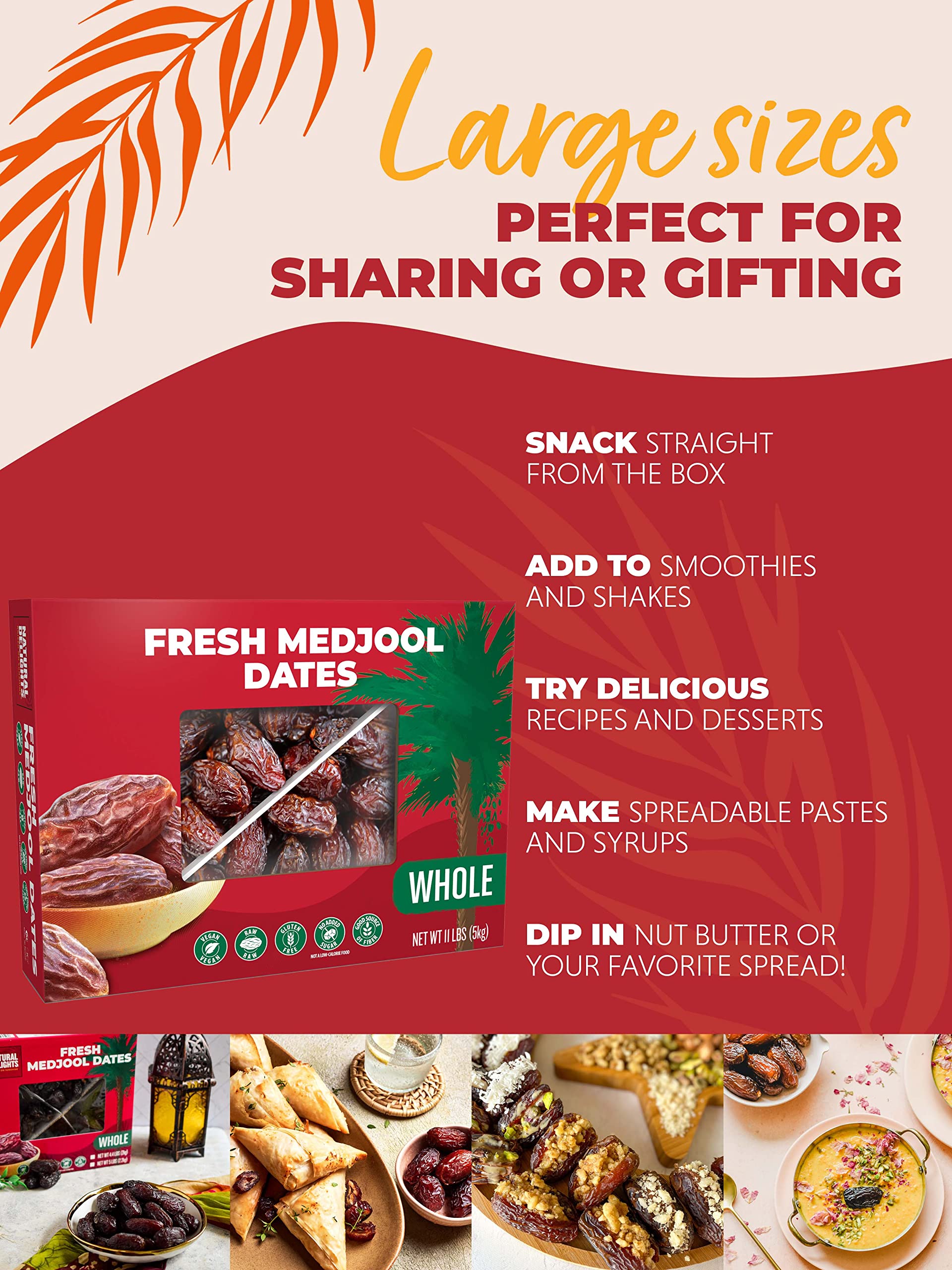 - Q: How versatile are Medjool Dates in meal preparation? A: Natural Delights Medjool Dates are highly versatile. They can be eaten on their own, added to salads, blended into smoothies, or used in various recipes, including energy bars and desserts.