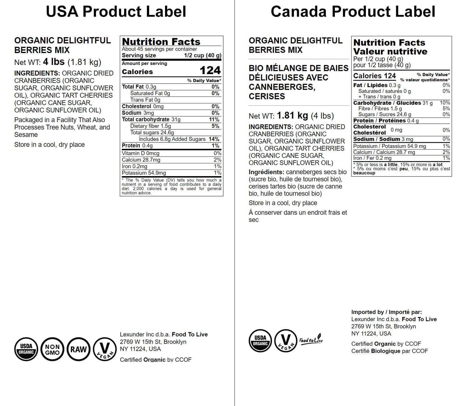 Organic Delightful Berries Mix, 4 Pounds - A Blend of Non-GMO Dried Cherries & Cranberries. Gently Infused with Organic Sugar. L