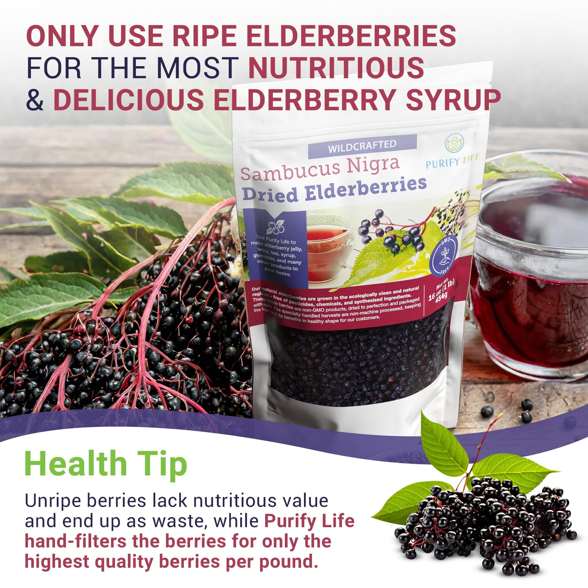 - Q: What makes Purify Life dried elderberries unique? A: Purify Life dried elderberries are hand-harvested from wildcrafted sources, ensuring they are non-GMO and free from synthetic chemicals or additives. This contributes to their natural quality and health benefits.