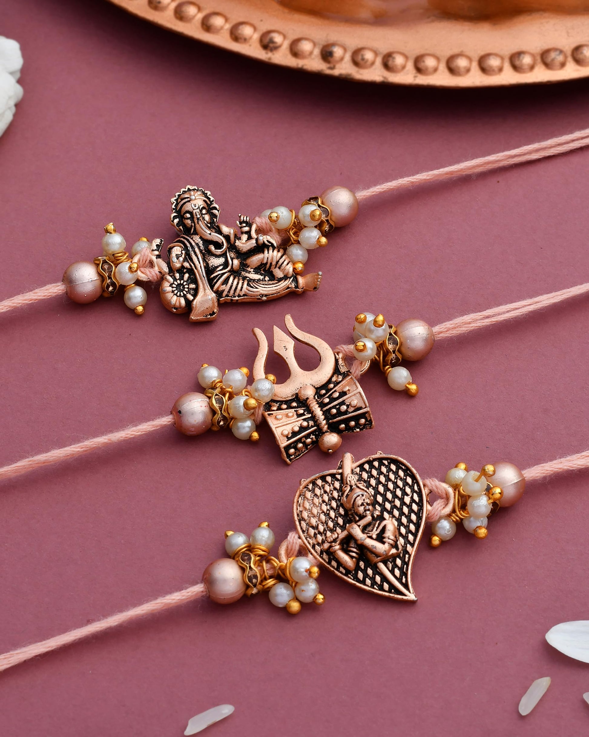 - Q: What makes the Trinity Rakhi set special? A: The Trinity Rakhi set is crafted with a gold-colored alloy that represents warmth and splendor. It features safe cotton threads symbolizing eternal love, along with imitation pearls that signify purity. Each rakhi in the set embodies creation, preservation, and destruction, invoking blessings for protection and guidance for the brother.