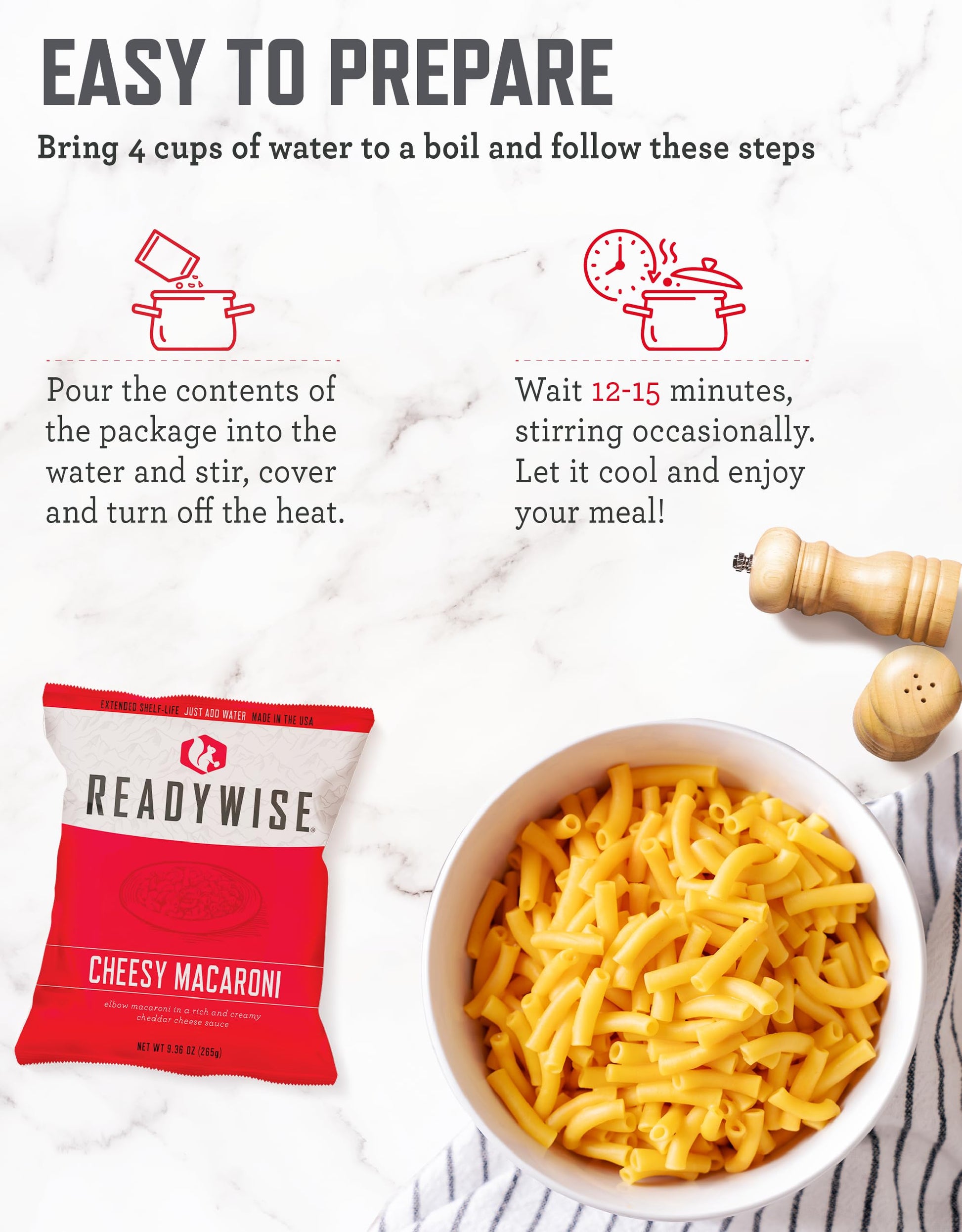 - Q: How do you prepare the meals in the ReadyWise Emergency Food Supply? A: Preparing meals from the ReadyWise Emergency Food Supply is simple. Just add water to the food in the pouch, stir, cover, and your meal will be ready in approximately 15 minutes.