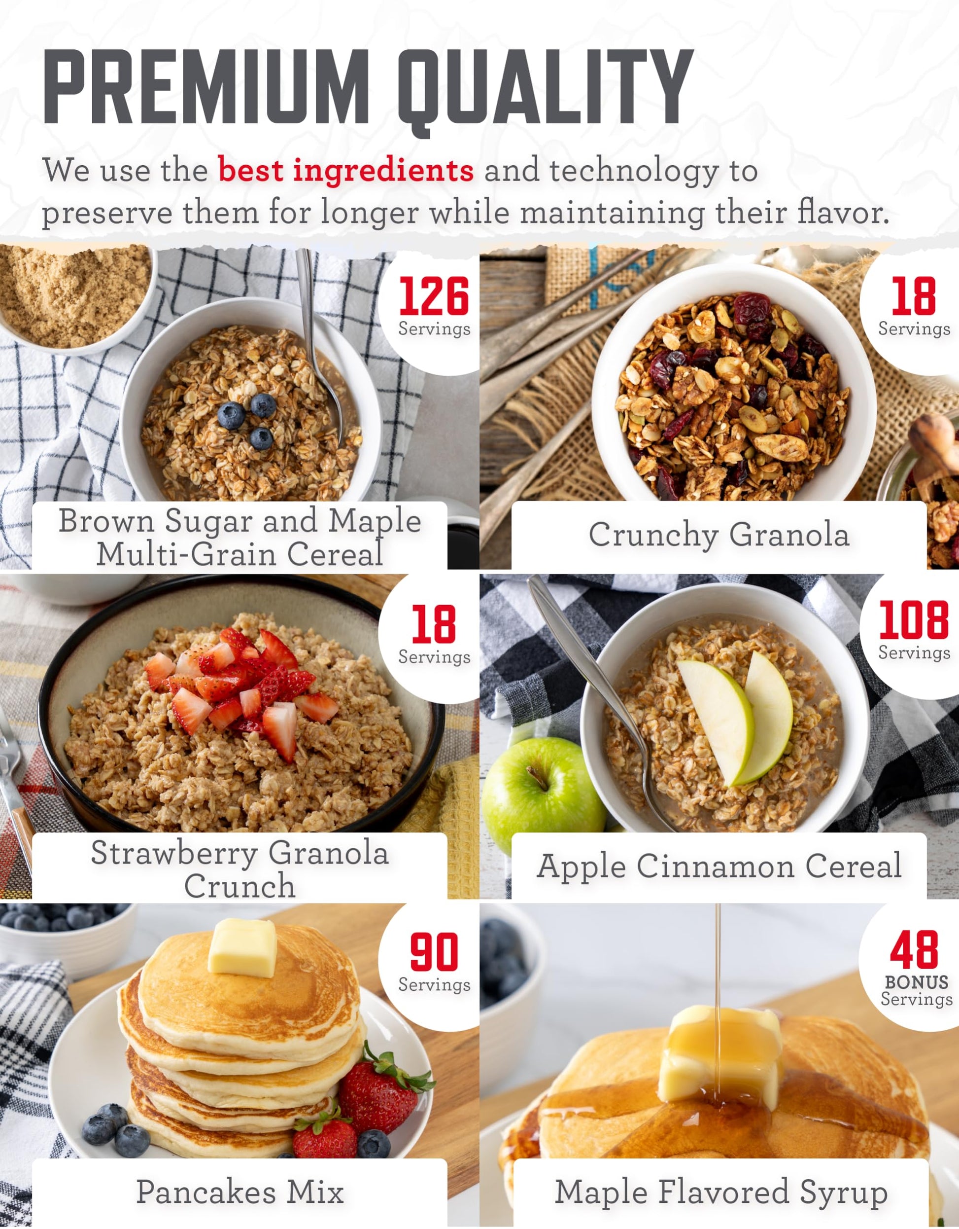 - Q: What types of meals are included in the ReadyWise Emergency Food Supply? A: The ReadyWise Emergency Food Supply includes a variety of meals such as Cheesy Lasagna, Creamy Pasta, Pasta Alfredo, Chili Mac, Chicken Noodle Soup, Savory Stroganoff, Hearty Tortilla Soup, Potato Pot Pie, Teriyaki and Rice, Baked Potato Casserole, Tomato Basil Soup, Southwest Beans and Rice, Cheesy Macaroni, Strawberry Granola Crunch, Brown Sugar and Maple Multi-Grain Cereal, and Apple Cinnamon Cereal.