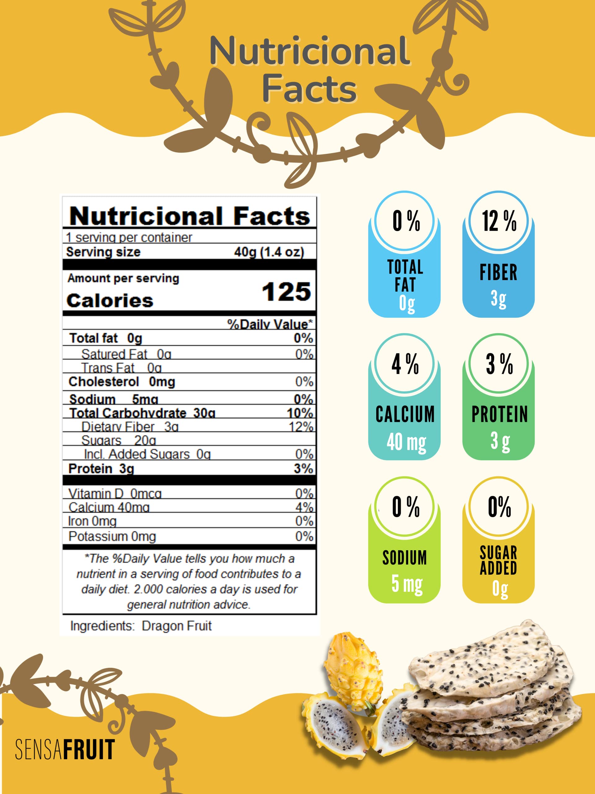 Q: What makes SENSAFRUIT Dried Dragon Fruit different from other dried fruits?A: SENSAFRUIT Dried Dragon Fruit is unique because it is made from high-quality Colombian fruit, carefully dehydrated without any additives, ensuring a pure and nutritious snack that supports local farming communities.