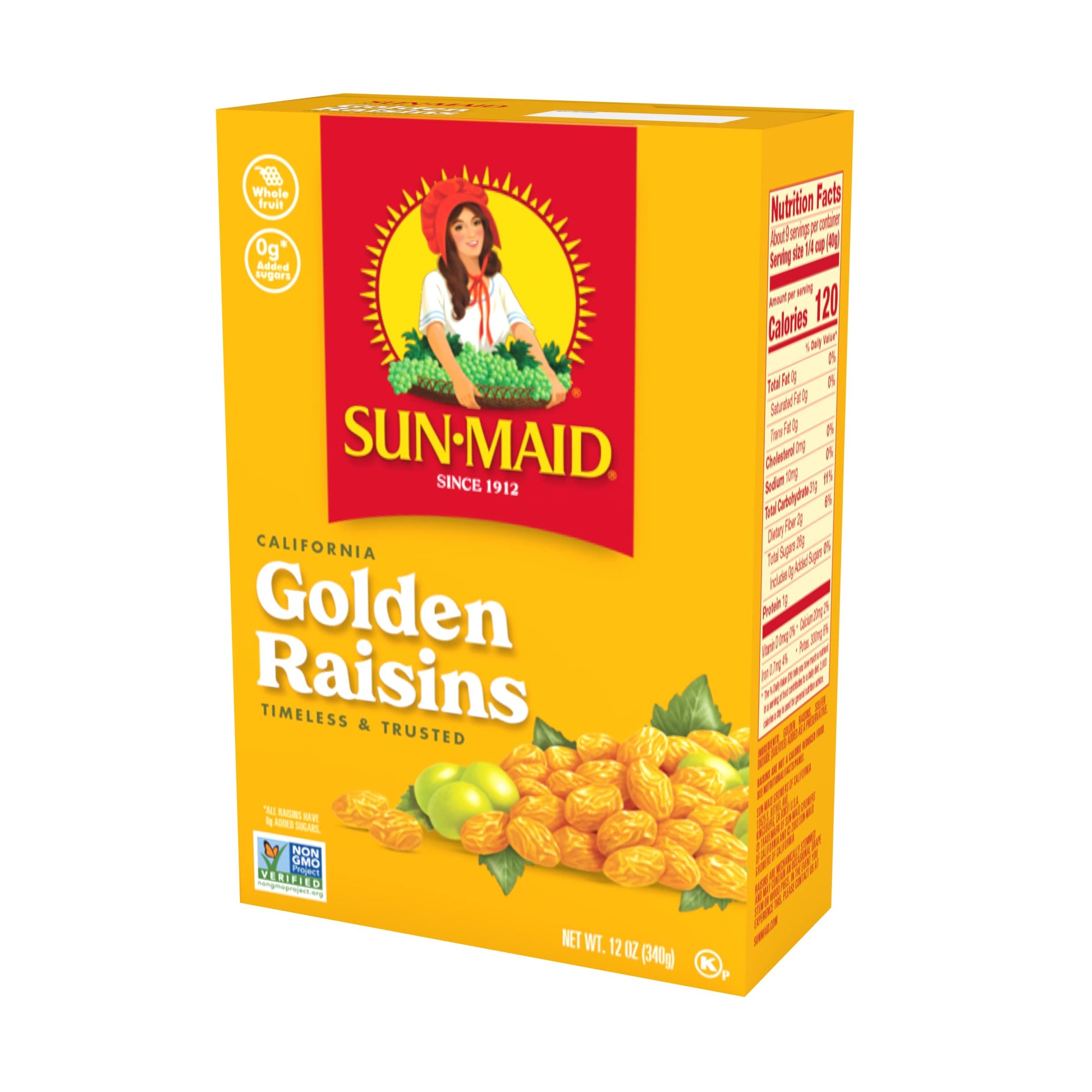 Sun-Maid Golden Raisins timeless and trusted goodness has been a classically delicious dried fruit snack for kids and grown-up kids alike since 1912. Plump, fruity, golden nuggets of goodness, Sun-Maid Golden Raisins are an all-time favorite for their tangy sweetness. So, whether you re baking or snacking on the go, enjoy a snack as timeless as the moment you re in.Delicious Sun-Maid Golden Raisins are a convenient and tasty low fat snack with 120 calories per serving. Due to the dehydration that takes place in dried fruits, raisins have more concentrated nutrition levels than grapes, making them a wholesome and easy snack for kids and adults alike.