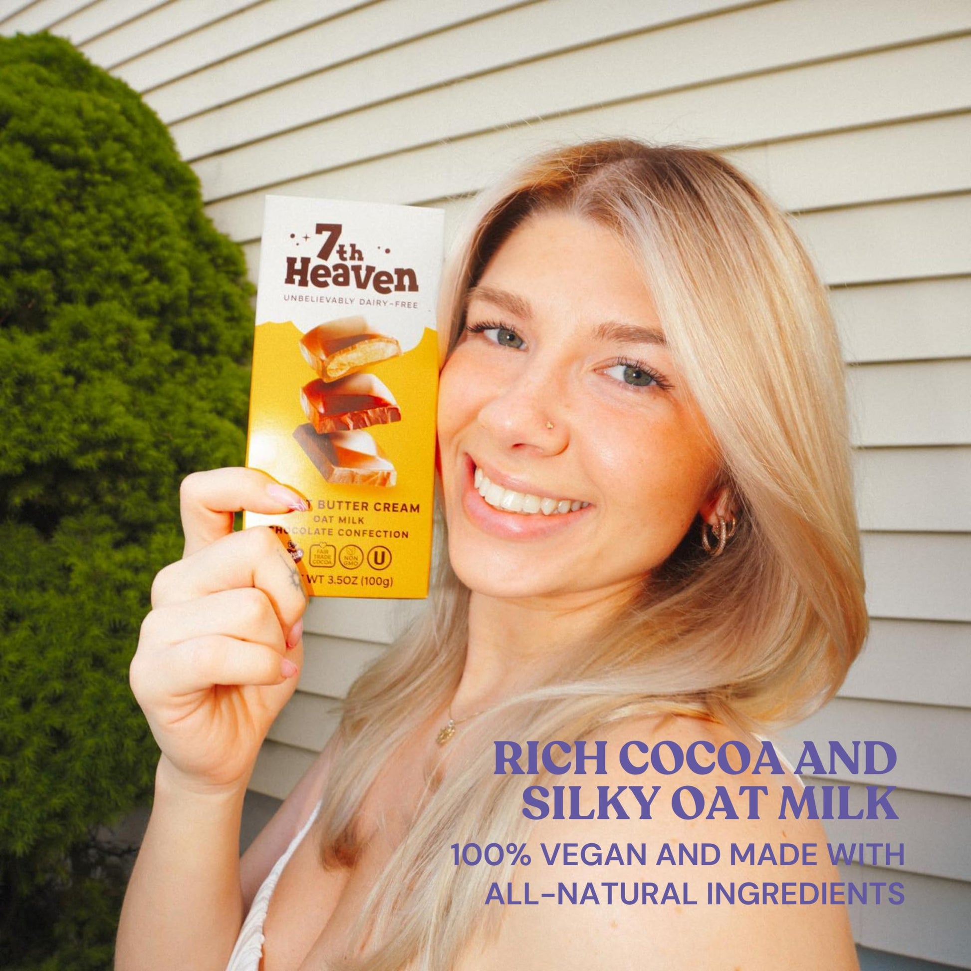 - Q: What is the best way to enjoy the 7th Heaven Vegan Peanut Butter Cream Oat Milk Chocolate Bars? A: These chocolate bars are perfect for on-the-go snacking, whether you're at work, traveling, or relaxing at home. They make great party favors, Halloween treats, or additions to gift baskets.