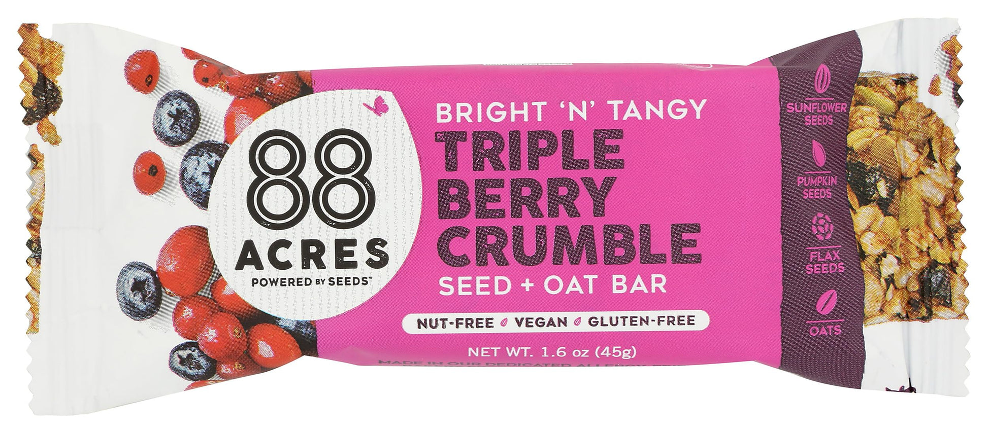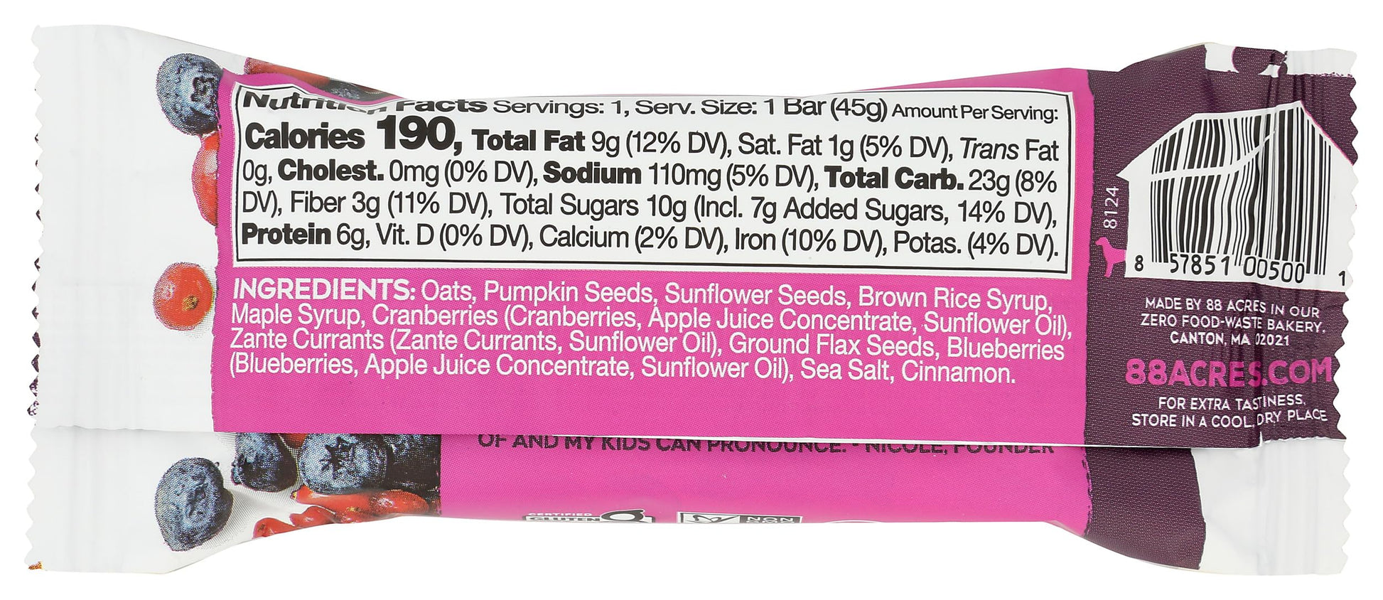 - Q: What are the main ingredients in the 88 Acres Triple Berry Blend Seed Bar? A: The 88 Acres Triple Berry Blend Seed Bar features a wholesome blend of cranberries, blueberries, and zante currants, combined with a touch of cinnamon for a deliciously nourishing snack.