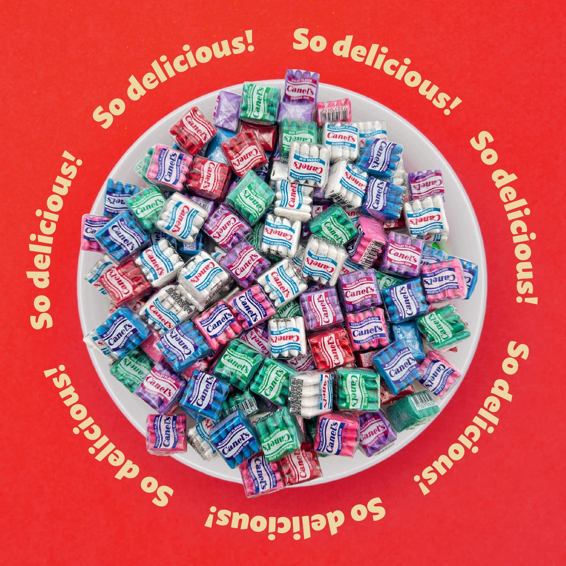 Q: What flavors are included in Canel's Original Chewing Gum?A: Canel's Original Chewing Gum comes in a variety of mouthwatering flavors, including Spearmint, Tutti-frutti, Peppermint, Cinnamon, Blueberry, and Violet, ensuring there's something for everyone to enjoy.