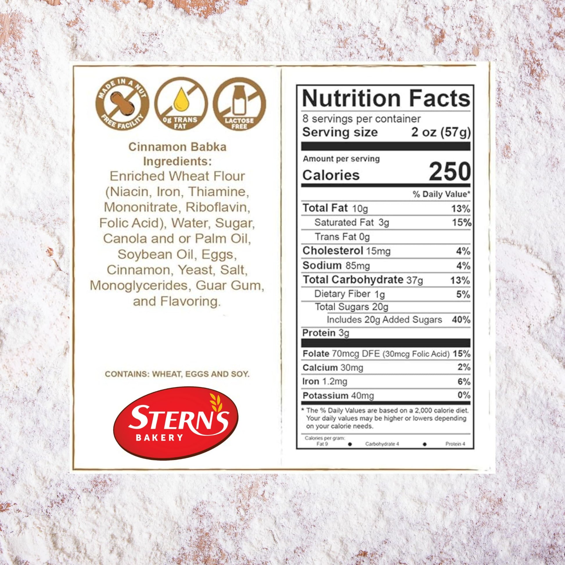 - Q: Is Stern's Bakery cinnamon babka kosher and nut-free? A: Yes, Stern's Bakery cinnamon babka is kosher certified by the OK and CRC. It is also baked in a nut-free facility, ensuring that it is safe for those with nut allergies.