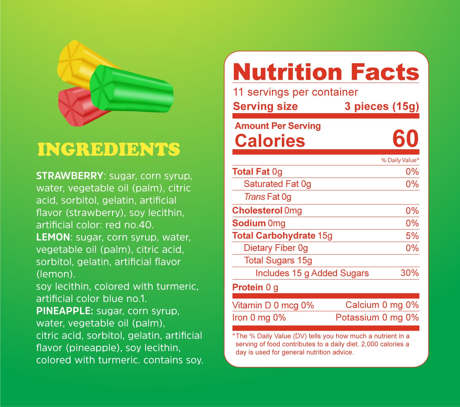 Q: What makes Colombina Fruity Chews a healthier candy option?A: Colombina Fruity Chews are made with high-quality ingredients and contain no artificial flavors, providing a guilt-free treat that you can enjoy anytime.