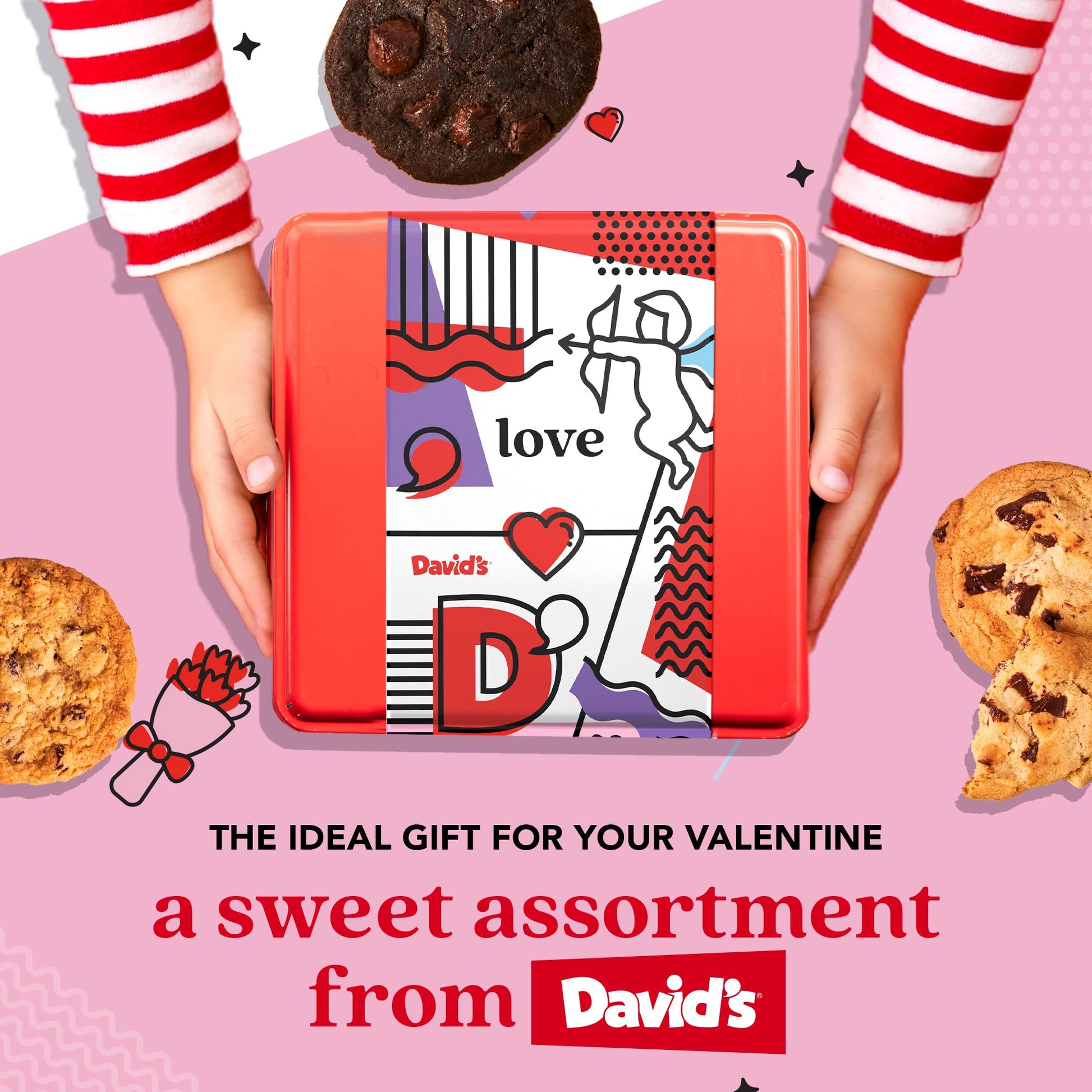 Q: What types of cookies are included in David's Cookies Love Tin?A: David's Cookies Love Tin includes a delicious assortment of cookies such as Chocolate Chunk, Peanut Butter with Peanut Butter Chips, Double Chocolate Chunk, Oatmeal Raisin, and Cherry White Chip. This variety is perfect for satisfying different taste preferences.