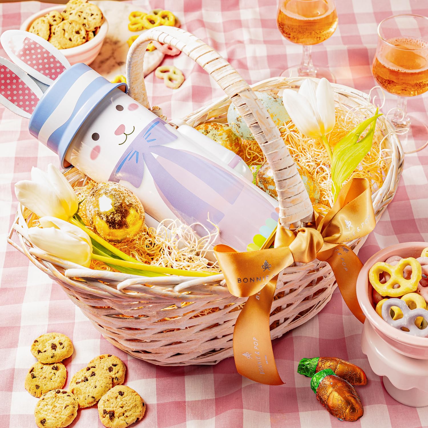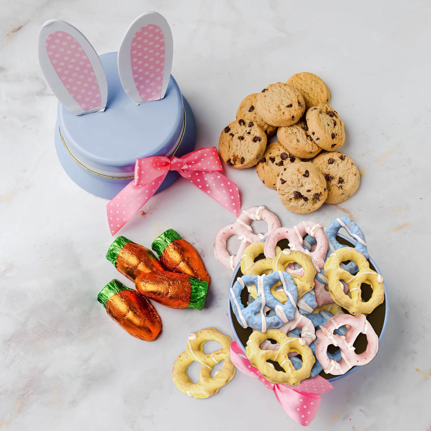 Q: What treats are included in the Easter Gift Basket?A: The Easter Gift Basket features a delightful assortment of treats including bunny bait, Easter-approved chocolate chip cookies, a solid milk chocolate bunny treat, festive popcorn, decadent chocolate eggs, and spring-inspired shortbread cookies shaped like flowers and butterflies.
