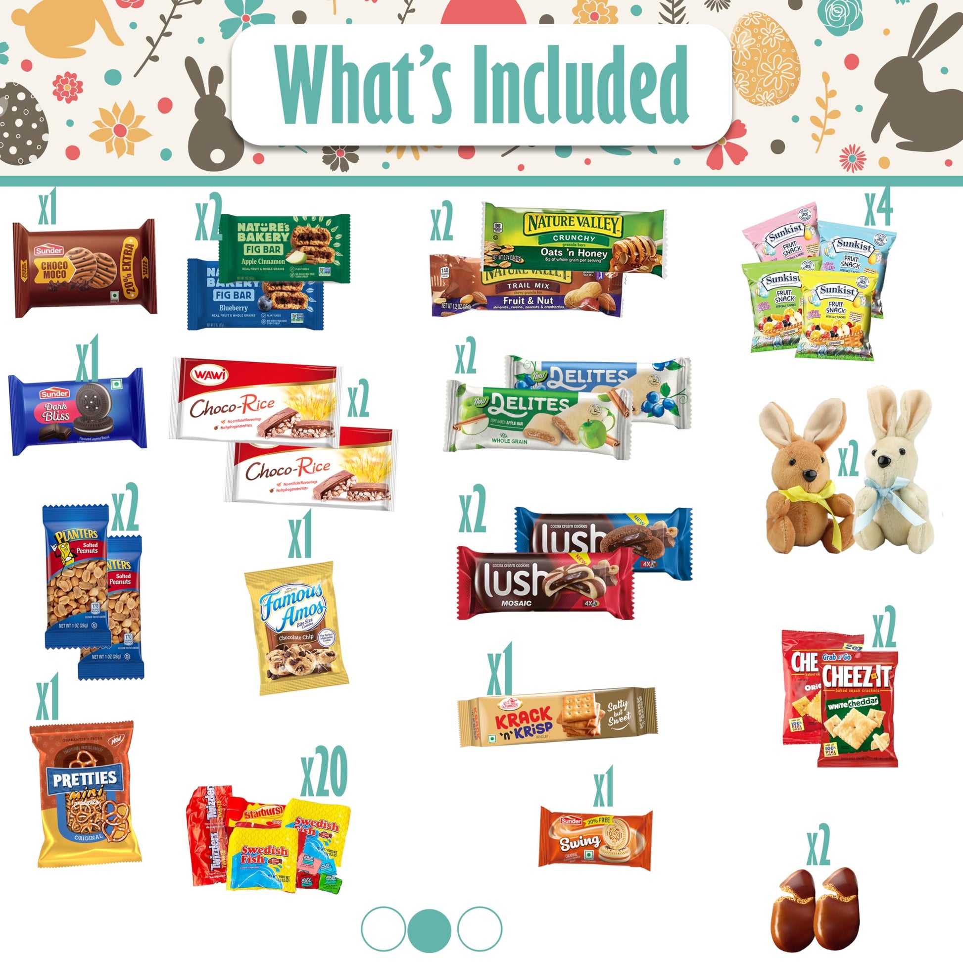Q: What types of snacks are included in the Easter Snack Box?A: The Easter Snack Box includes a delightful assortment of snacks such as cookies, candies, and various sweet treats, providing a variety of flavors to satisfy any craving during your holiday celebrations.
