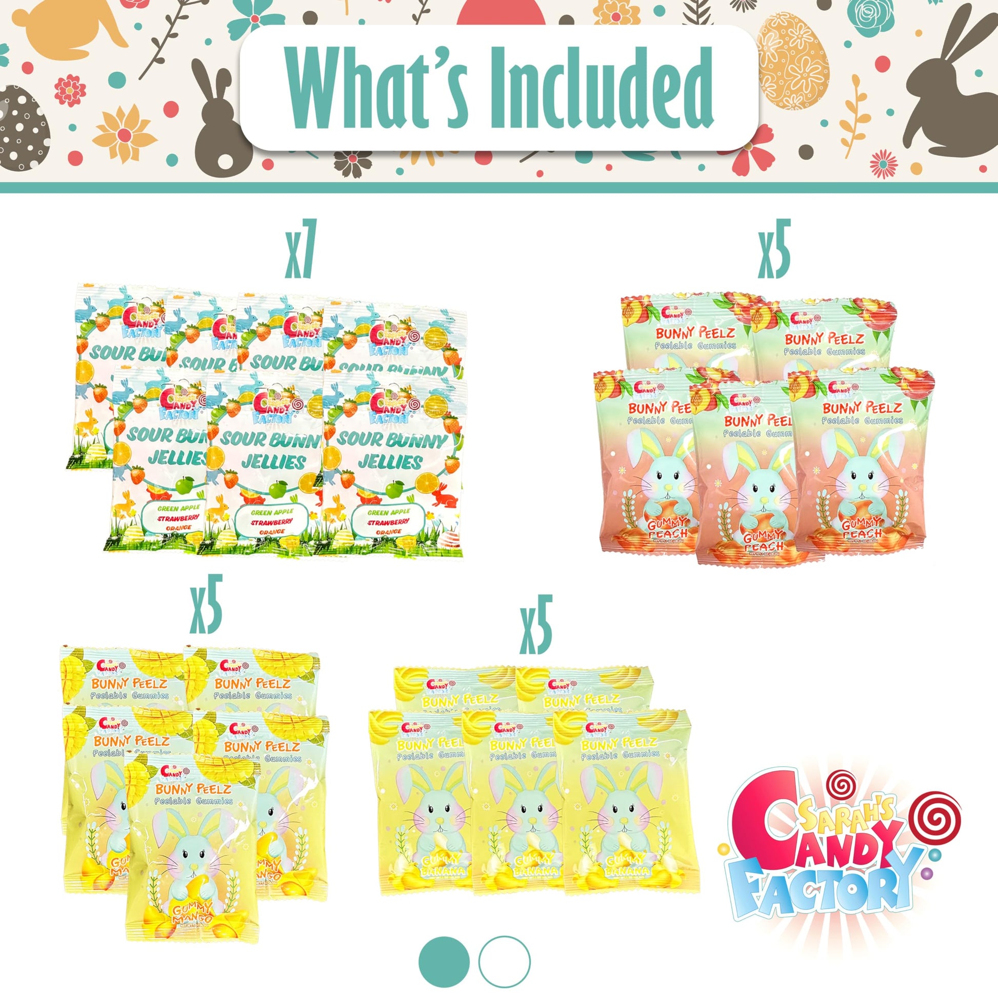 Q: What types of snacks are included in the Easter Snack Box?A: The Easter Snack Box includes a delightful assortment of sweet snacks such as cookies, candies, and other sugary treats, carefully selected to satisfy a variety of cravings for both kids and adults.