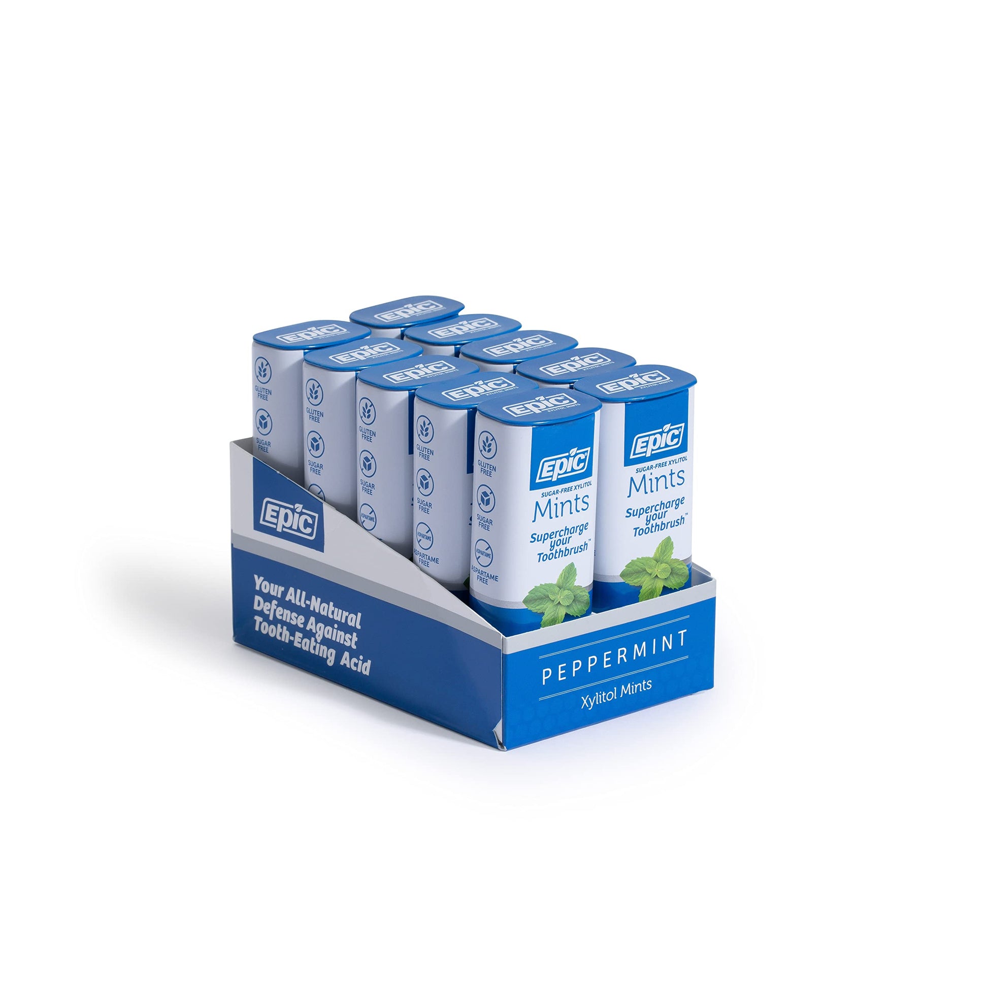 Finding Sugar-Free Mints That Satisfy Your Cravings And Help Stop Tooth Decay And Dry Mouth? Not As Impossible As You'D Think... Sugarless, Aspartame-Free And Sweetened Exclusively With Xylitol, Epic Mints Deliver A Great Tasting Product While Helping You Get The Daily 6 Grams Of Xylitol Recommended By Dentists Worldwide. Just 2 Pieces Of Epic Xylitol Mints Contain 1 Whole Grams Of Xylitol. That'S Enough To Really Pack A Punch And Helps You Easily Reach Your Daily Recommended Amount Of Xylitol (6G - 10G Per Day). Not Only Do Epic Mints Taste Great But They Can Help Fight Tooth Decay, Support Healthy Gums, Freshen Bad Breath And Help Reduce Dry Mouth. Plus, With All Natural Gluten-Free, Non-Gmo, Vegan Ingredients, You Can Confidently Use Them As A Safe Candy Alternative For Your Kids. Epic Mints Are Available In A Variety Of Savory Choices, But You Simply Can'T Go Wrong With Our Peppermint Flavor. Sure, We Have Other Flavors, Too, But Peppermint Has Always Been A Classic For Mint Connoisseurs. Packaged In 10 Convenient Tins With 55 Pieces Each, These Mints Store Easily, Stay Fresh And Offer Plenty To Share!