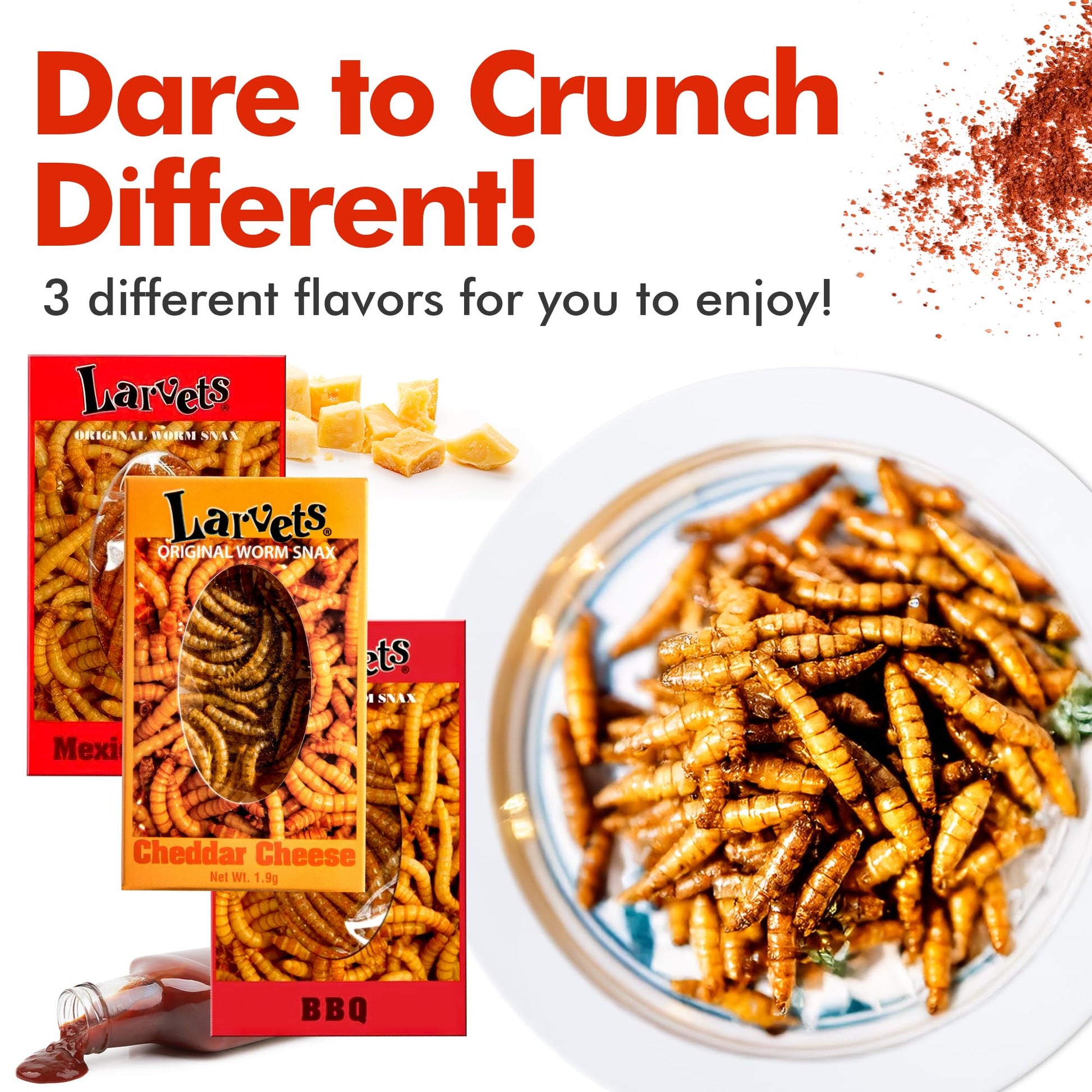 Q: What flavors are included in the HotLix Larvets Edible Bugs 3-Pack?A: The HotLix Larvets Edible Bugs 3-Pack includes three unique flavors: Cheddar Cheese, BBQ, and Mexican Cheese, offering a variety of adventurous tastes for those looking to try something different.