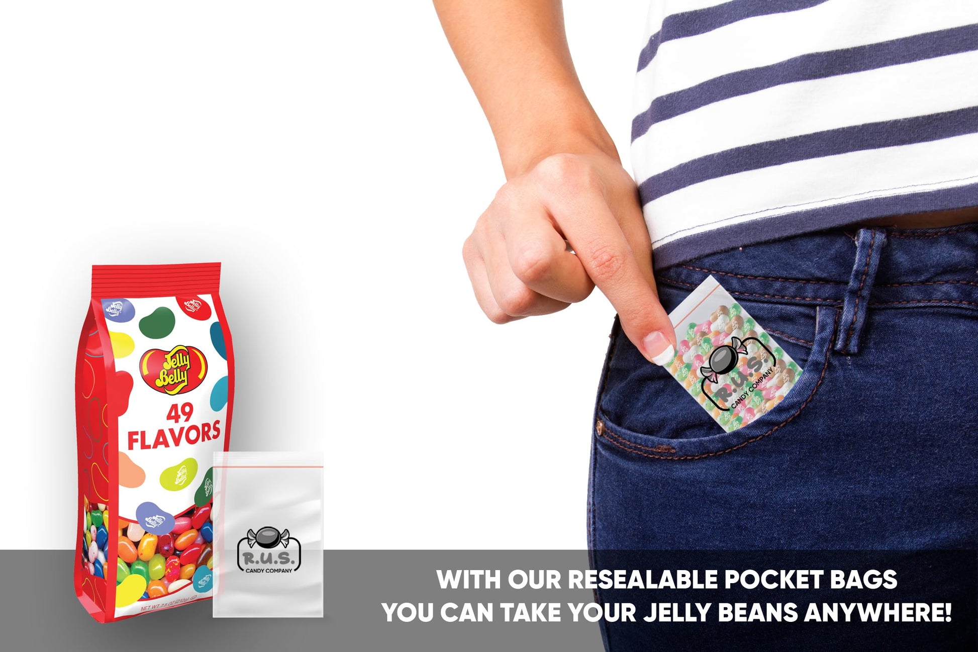 Q: What is the significance of the R.U.S. Candy Company travel size pocket bag?A: The R.U.S. Candy Company travel size pocket bag allows for convenient portability, enabling you to carry smaller portions of Jelly Belly jelly beans wherever you go, making it perfect for on-the-go snacking.