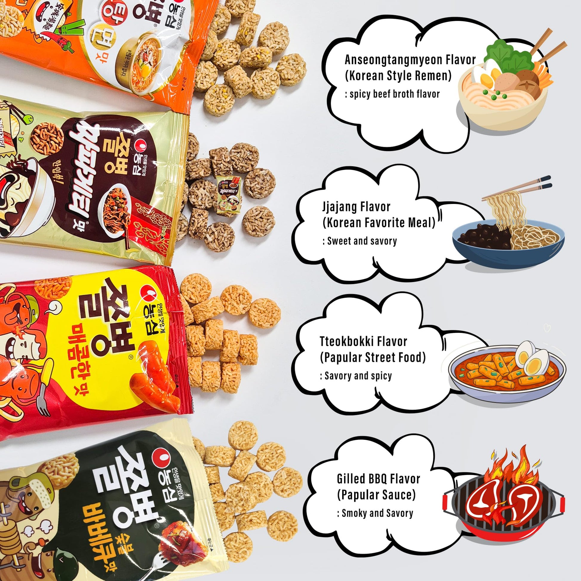 - Q: What flavors are included in the JOAYO JJOL BYEONG SNACK variety pack? A: The JOAYO JJOL BYEONG SNACK variety pack includes four delicious flavors: Hot Tteokbokki, which is spicy and savory; Chapagetti with a sweet and smoky black bean sauce; Anseongtangmyeon, which is a little spicy with hints of garlic and onion; and Grilled BBQ, flavored with Korean barbecue sauce.