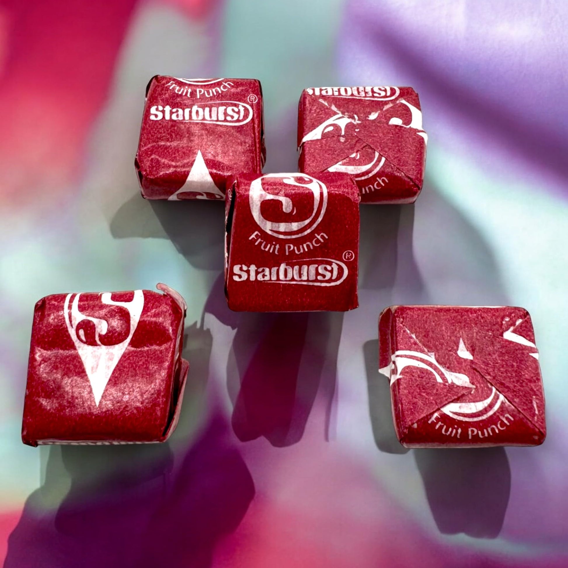 Q: What is the flavor profile of the Fruit Punch Starburst?A: The Fruit Punch Starburst features a vibrant and delicious fruit punch flavor that is both sweet and tangy, providing a refreshing taste experience with every chewy bite.
