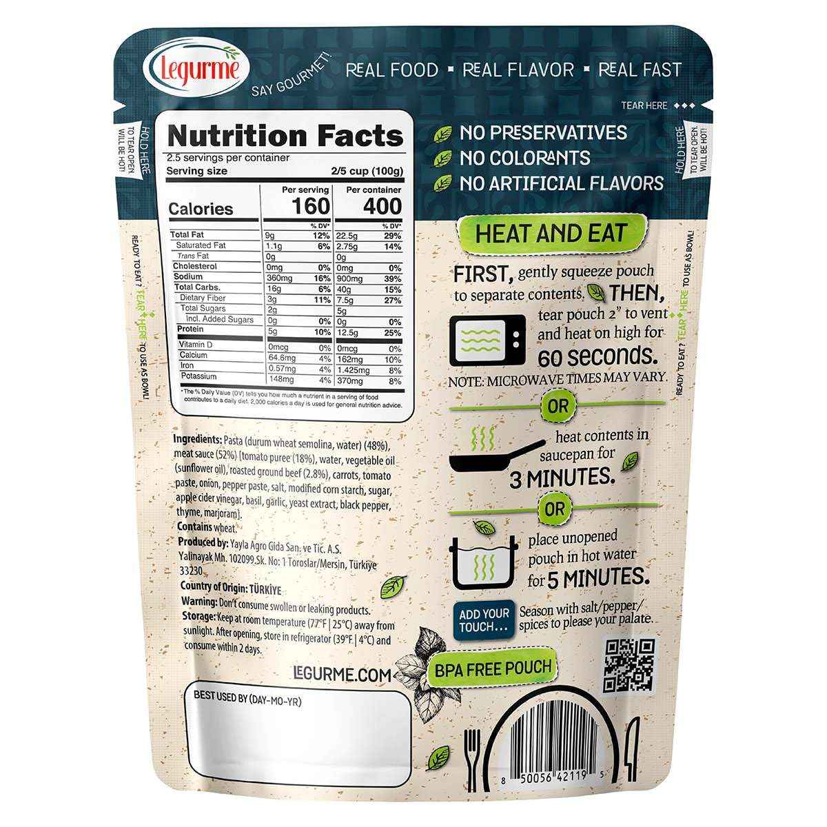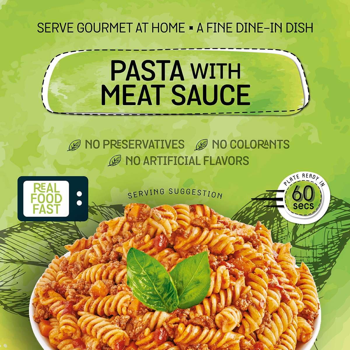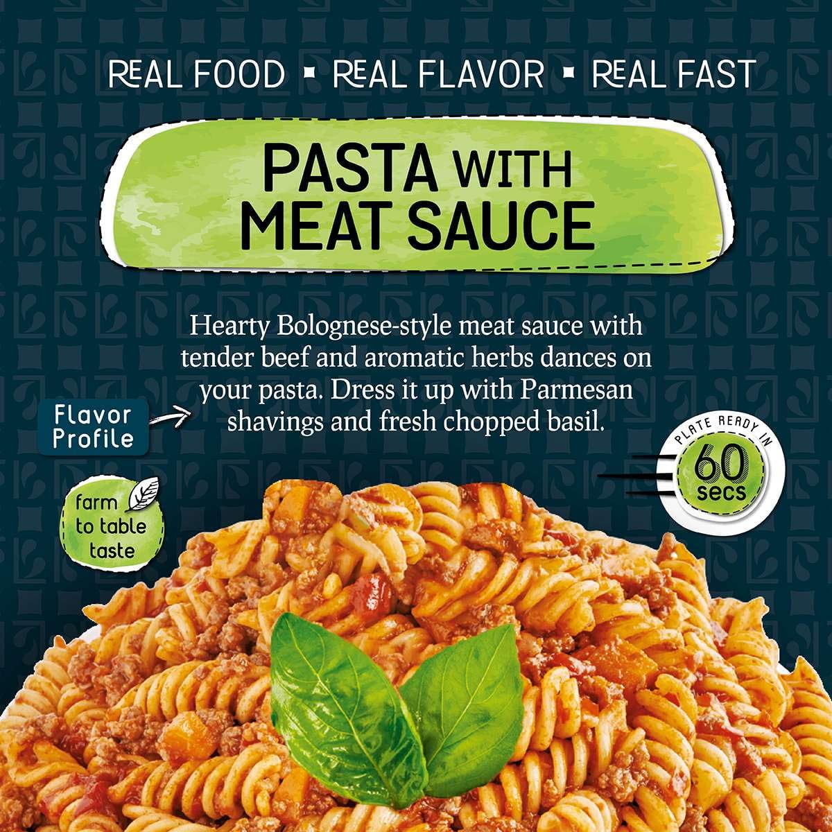 Q: What is the serving size of the Mediterranean Pasta with Meat Sauce?A: Each pouch contains 8.8 ounces of hearty Bolognese-style meat sauce, and this product is sold in a pack of 12, perfect for multiple meals.