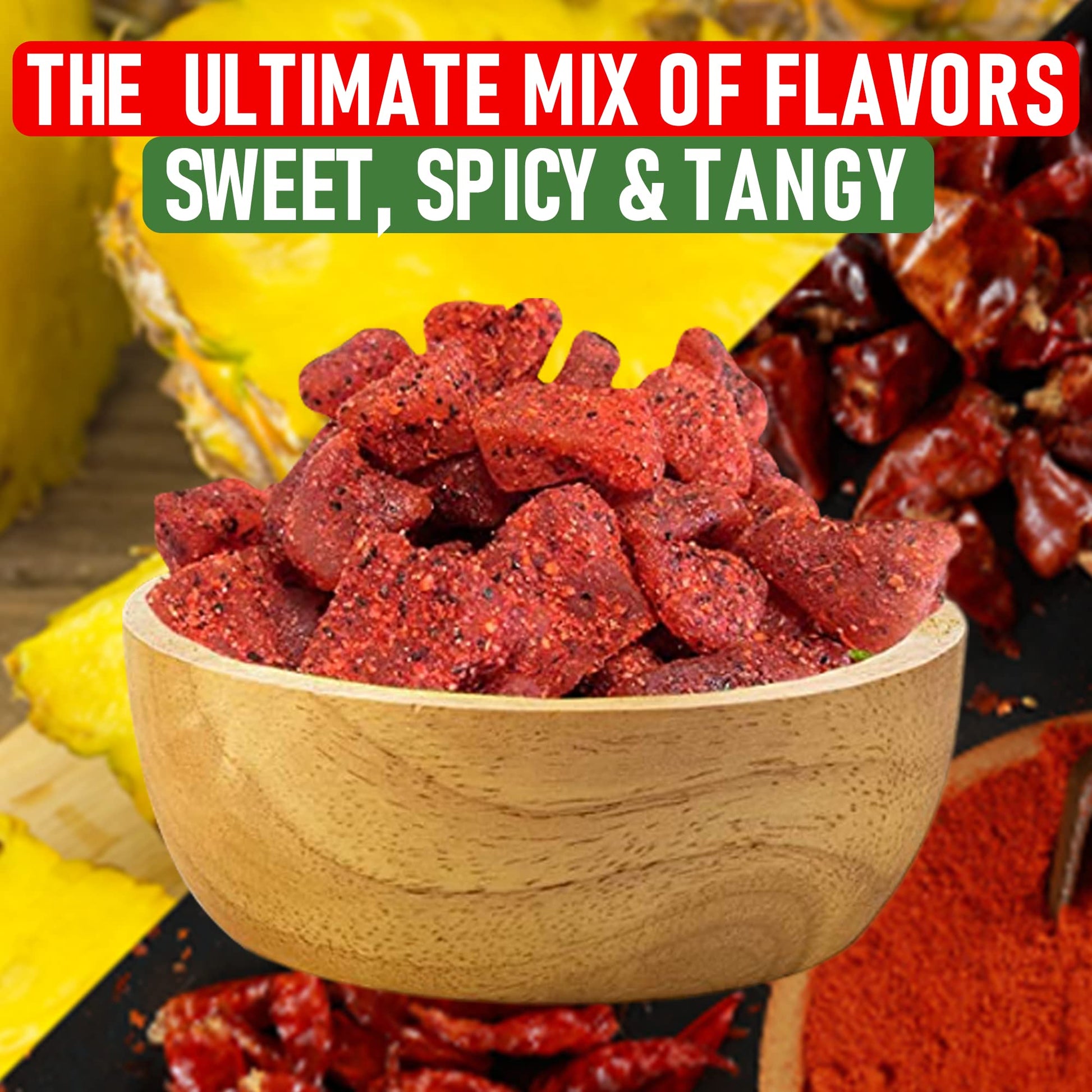 Q: What flavors are included in the Mexican Fruit Candy 3-Pack?A: The Mexican Fruit Candy 3-Pack includes three exciting flavors: Mango Chamoy, Pineapple with Chili, and Tamarind with Chili, offering a delightful combination of sweet and spicy tastes.