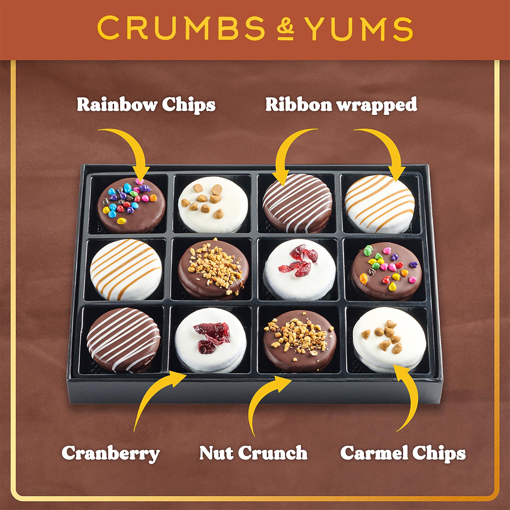 Crumbs & Yums Brings You The Ultimate Holiday Treat With This Christmas Gift Basket, Featuring 12 Gourmet Sandwich Cookies In Five Indulgent Flavors: Cranberry, Nut Crunch, Ribbon Wrapped, Rainbow Chips, And Chocolate Chip. Each Cookie Is Dipped In Premium Chocolate, And Packed In An Elegant Black Box, Perfect For Gifting. Ideal For Christmas, Birthdays, Or Special Occasions, This Gift Basket Adds A Delicious Touch To Any Celebration. Made With High-Quality Ingredients, These Cookies Guarantee Fresh, Rich Flavors In Every Bite. Share The Joy Or Treat Yourself This Holiday Season!