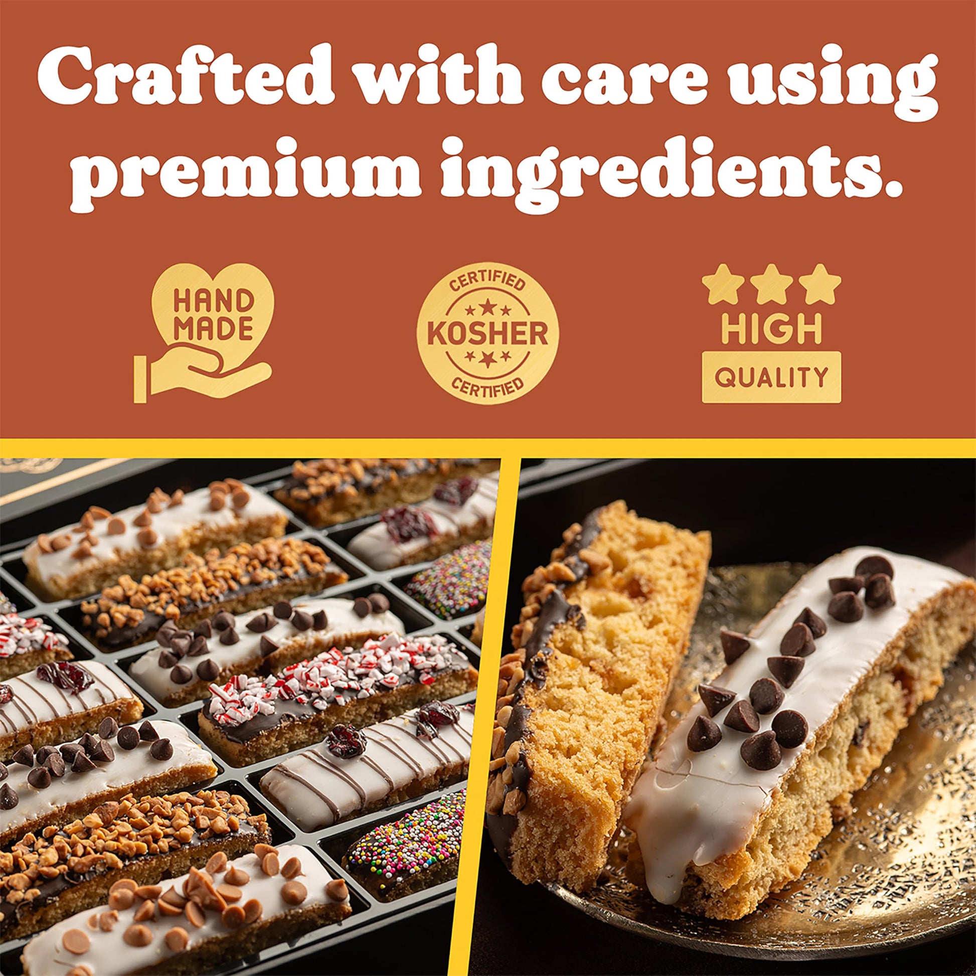 Crumbs & Yums Black Basket Christmas Gift Basket Crumbs & Yums Presents The Perfect Holiday Indulgence With This Black Basket Christmas Gift Basket, Featuring 18 Handcrafted Gourmet Biscotti. Each Biscotti Is Topped With Six Decadent Flavors, Including Caramel Chips, Chocolate Chips, Nut Crunch, Dried Cranberries, Crushed Peppermint, And Rainbow Sprinkles. Freshly Baked And Coated In Rich Chocolate, These Artisanal Treats Are Packaged In A Sleek Black Basket, Making Them An Elegant And Thoughtful Gift For Any Occasion. Whether Youre Celebrating Christmas, A Birthday, Or An Anniversary, This Gift Basket Adds A Touch Of Sophistication To Every Event. Kosher Certified And Made With High-Quality Ingredients, Each Biscotti Guarantees Fresh, Premium Flavors That Everyone Will Enjoy. Treat Your Loved Ones Or Yourself To The Joy Of Crumbs & Yums This Holiday Season!