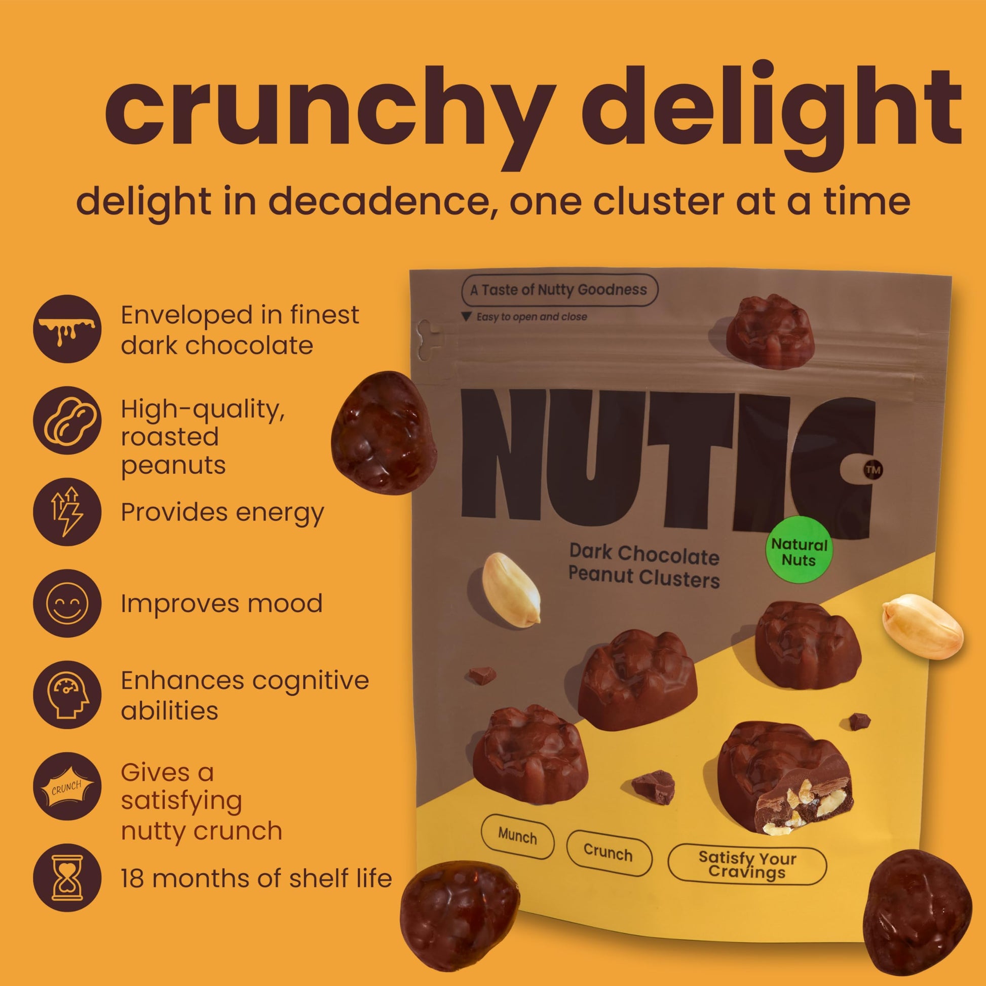 Q: What ingredients are used in Nutic Dark Chocolate Covered Peanut Clusters?A: Nutic Dark Chocolate Covered Peanut Clusters are made with high-quality roasted peanuts and luxurious dark chocolate, ensuring a rich and satisfying snack experience.