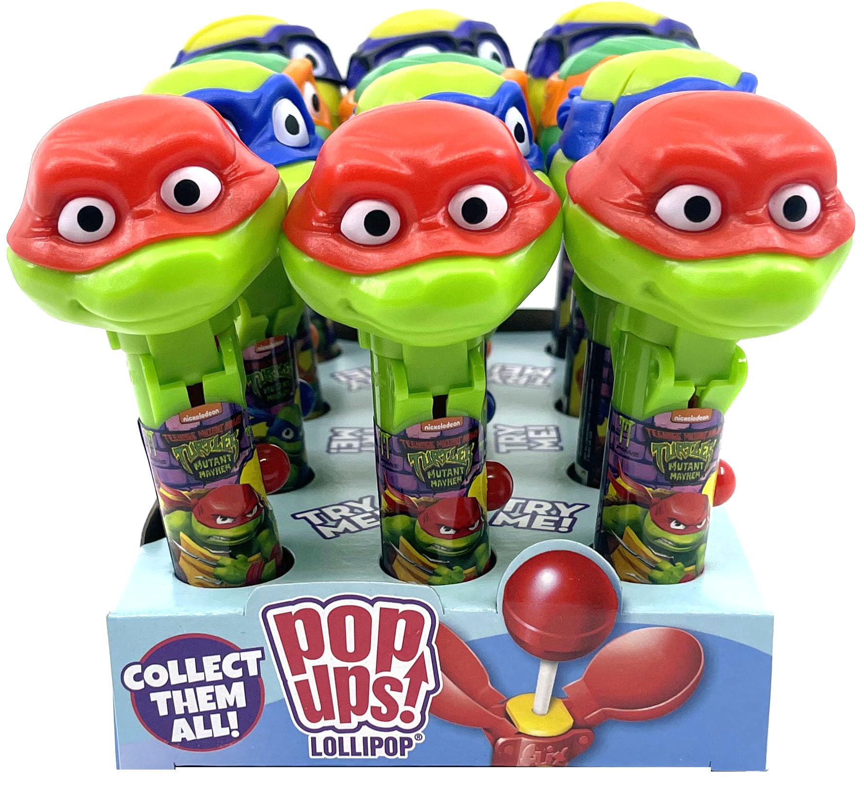 Q: What flavors of lollipops are included with the Teenage Mutant Ninja Turtle lollipop holders?A: The Pop Ups! Teenage Mutant Ninja Turtle lollipop holders come with an assortment of three delicious flavors: Watermelon, Cherry, and Strawberry.