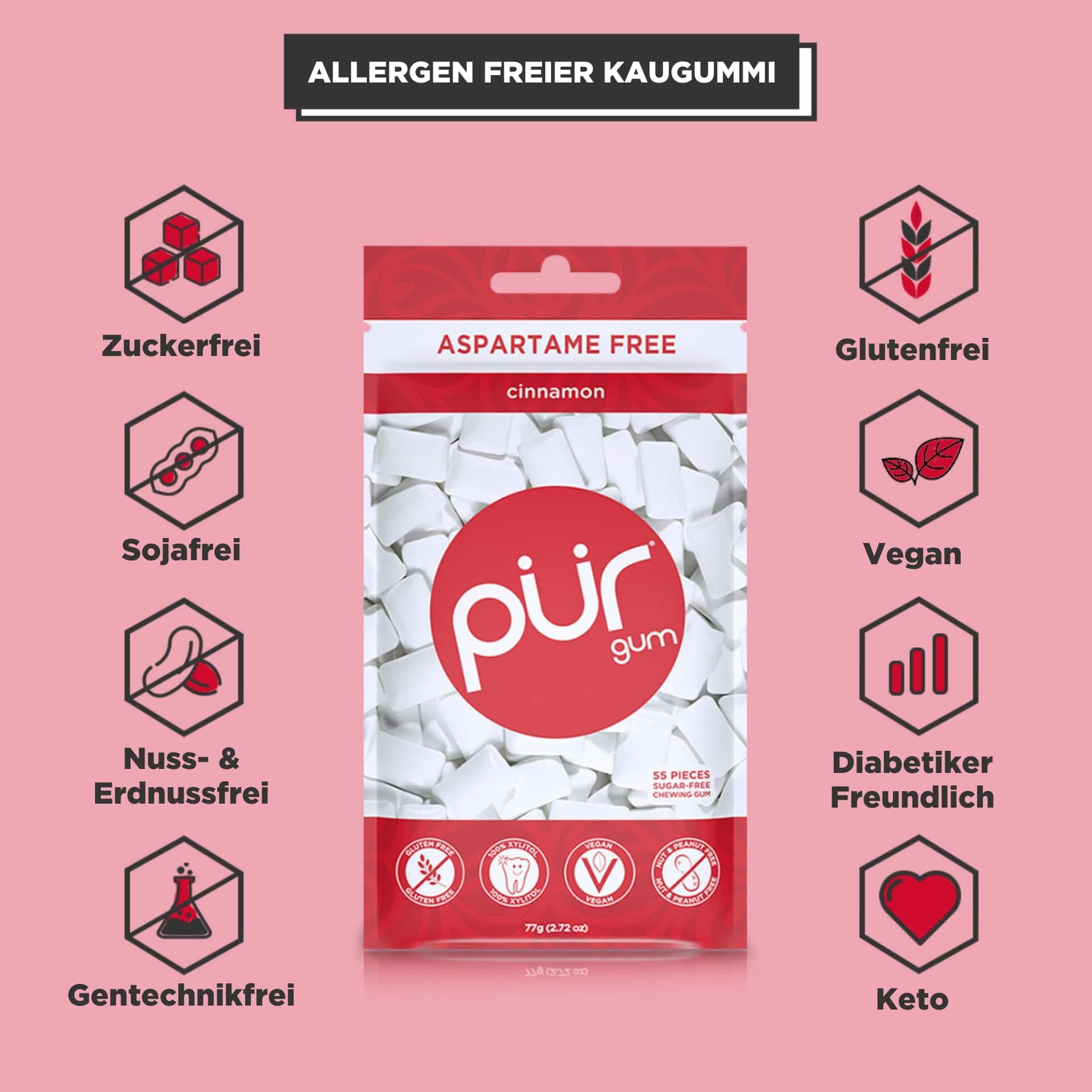 Cinnamonthis Sugar Free Gum Has A Hot & Intense Fiery Rush! Enjoy The Flavorful Combination Of Sweet And Spicy Cinnamon.Each Resealable Bag Of Cinnamon Gum Contains 55 Pieces. Pur Gum Is Also Available In Peppermint, Spearmint, Wintergreen, Bubblegum, Pomegranate Mint, Coolmint, And Chocolate Mint Flavors.Our Storyfounded In 2010, Pur Was Built On The Founding Principle Of Making Simple Substitutions To Promote A Healthier Lifestyle, Without Compromising Taste Or Quality! With A Growing Number Of Dietary Restrictions And Health-Conscious Consumers, Pur Set Out To Create Products That Everyone Could Safely Consume, Enjoy And Share!Naturally Sweetened With 100% Xylitolpur Uses Xylitol Sustainably Sourced From Birch And Maple Trees Grown In Finland. It Looks And Tastes Just Like Sugar With 40% Less Calories Than Sugar While Boosting Oral Health.Swiss-Madeall Our Ingredients Are Sourced From Europe And Made In Switzerland. Pur Is A Quality First Brand.