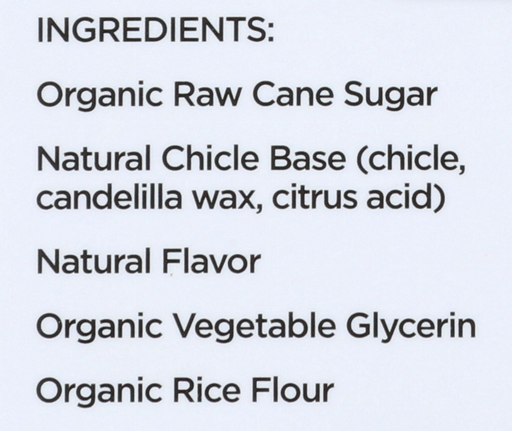 - Q: What are the ingredients in Simplygum Gum Mint Natural? A: Simplygum Gum Mint Natural is made with high-quality ingredients including Organic Raw Cane Sugar, a natural chicle base (which consists of chicle, candelilla wax, and citric acid), Peppermint Oil, Organic Vegetable Glycerin, and Organic Rice Flour. It is free from artificial ingredients, making it a healthier choice for chewing gum.