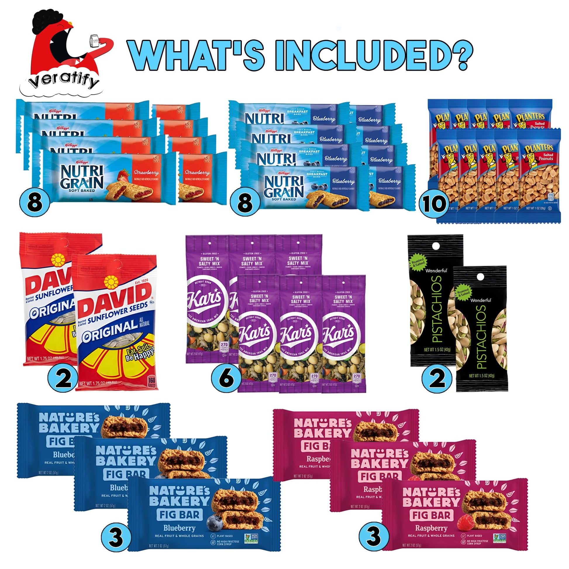 Savor The Delightful Variety In Every Bite With Our 100% Guaranteed Fresh Snack Gift Basket! Indulge In An Assortment Of 101 Premium Bars And Nuts, Including Granola Bars, Breakfast Bars, Trail Mixes, And Variety Of Nuts - A Perfect Blend Of Flavors And Textures To Satisfy Any Craving. This Gift Basket Are An Excellent Choice For Home, Work, School, Picnics, Parties, Colleges, Road Trips, Or The Office. Elevate Your Meetings, Events, Movie Nights, Or Gatherings By Sharing These Delectable Treats With Friends And Colleagues. Or, Simply Keep Them All To Yourself For A Guilt-Free Indulgence. With Our Freshness Guarantee, You Can Snack Confidently, Knowing That Every Bite Will Be As Delicious As The Last. Enjoy The Convenience And Variety This Snack Box Offers, And Let The Flavors Tantalize Your Taste Buds!
