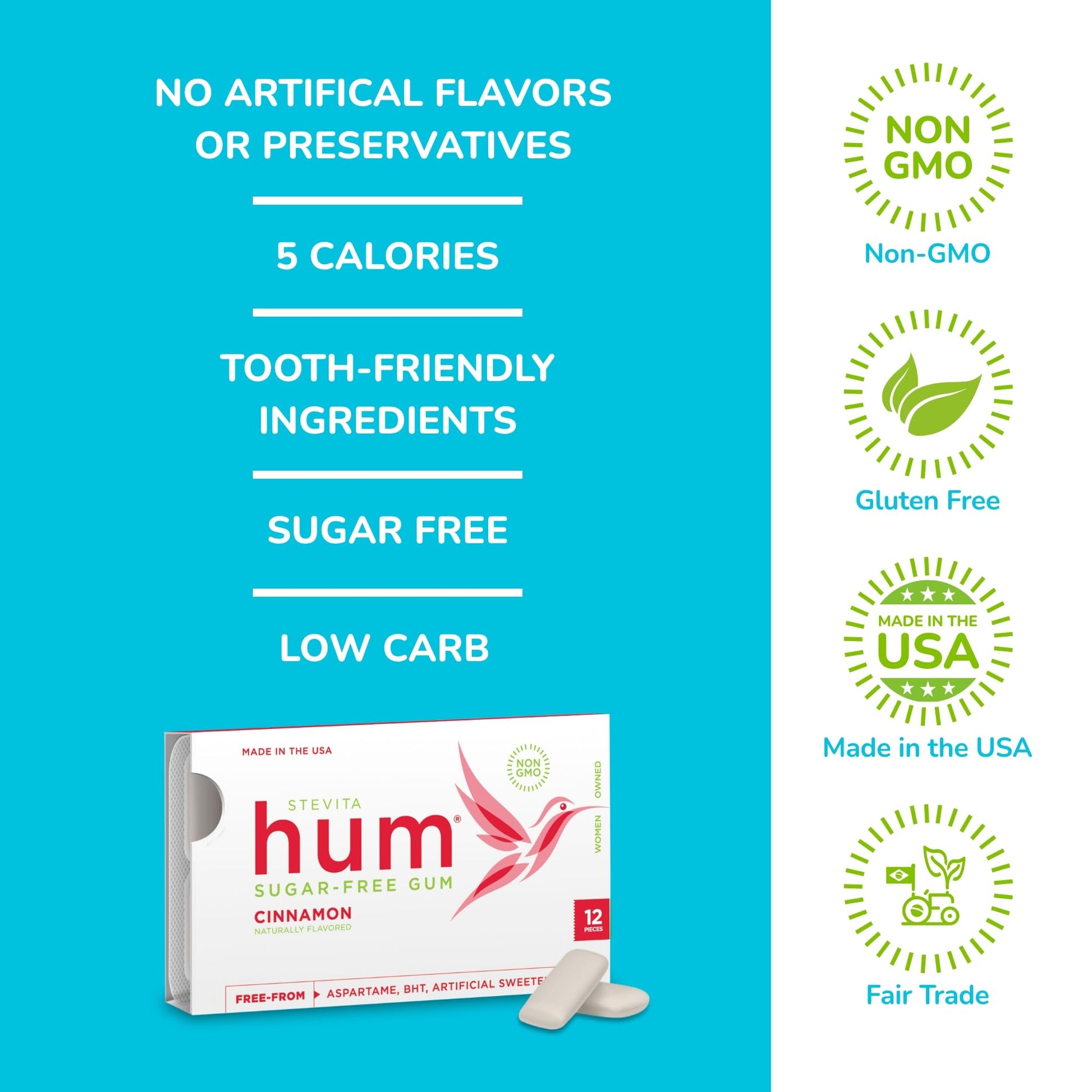Q: How many pieces are in a pack of Stevita Hum Cinnamon gum?A: Each pack of Stevita Hum Cinnamon gum contains 12 pieces, and you receive 12 packs in total, providing 72 total servings.