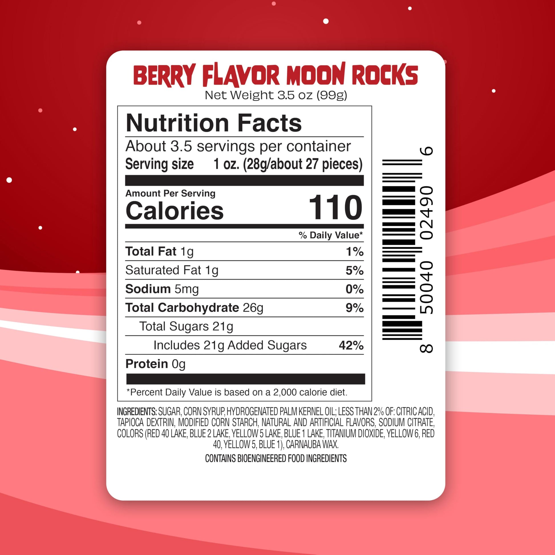 Q: What flavors are included in the Berry Moon Rocks?A: The Berry Moon Rocks come in a delightful mix of flavors including Berry Punch, Strawberry, Melon Berry, Wild Cherry, and Raspberry, offering a tasty treat for candy lovers.