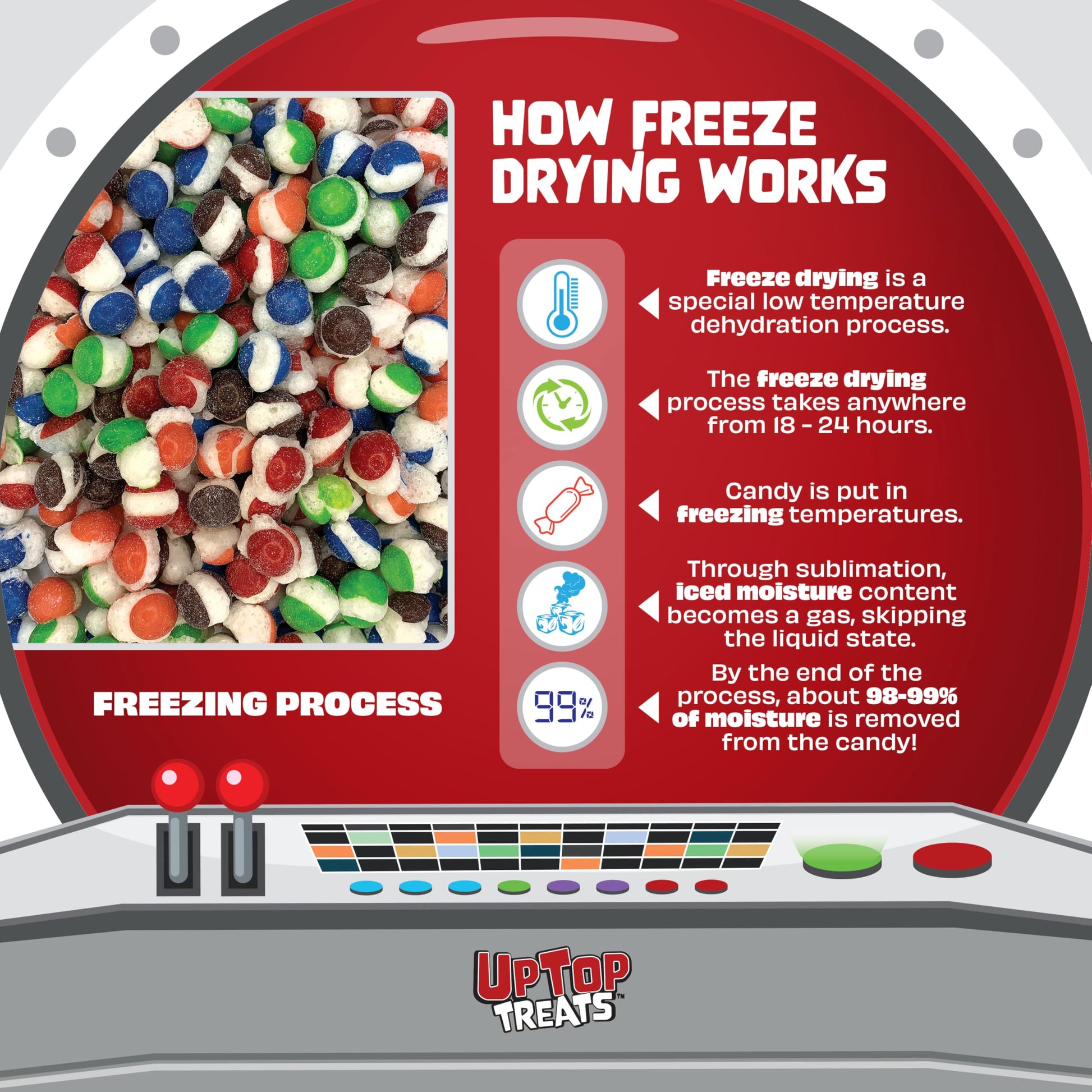 Q: How does the freeze drying process affect the candy?A: The freeze drying process removes nearly all moisture from the candy, resulting in a light and crunchy texture that enhances the flavor and makes it a unique snack option.