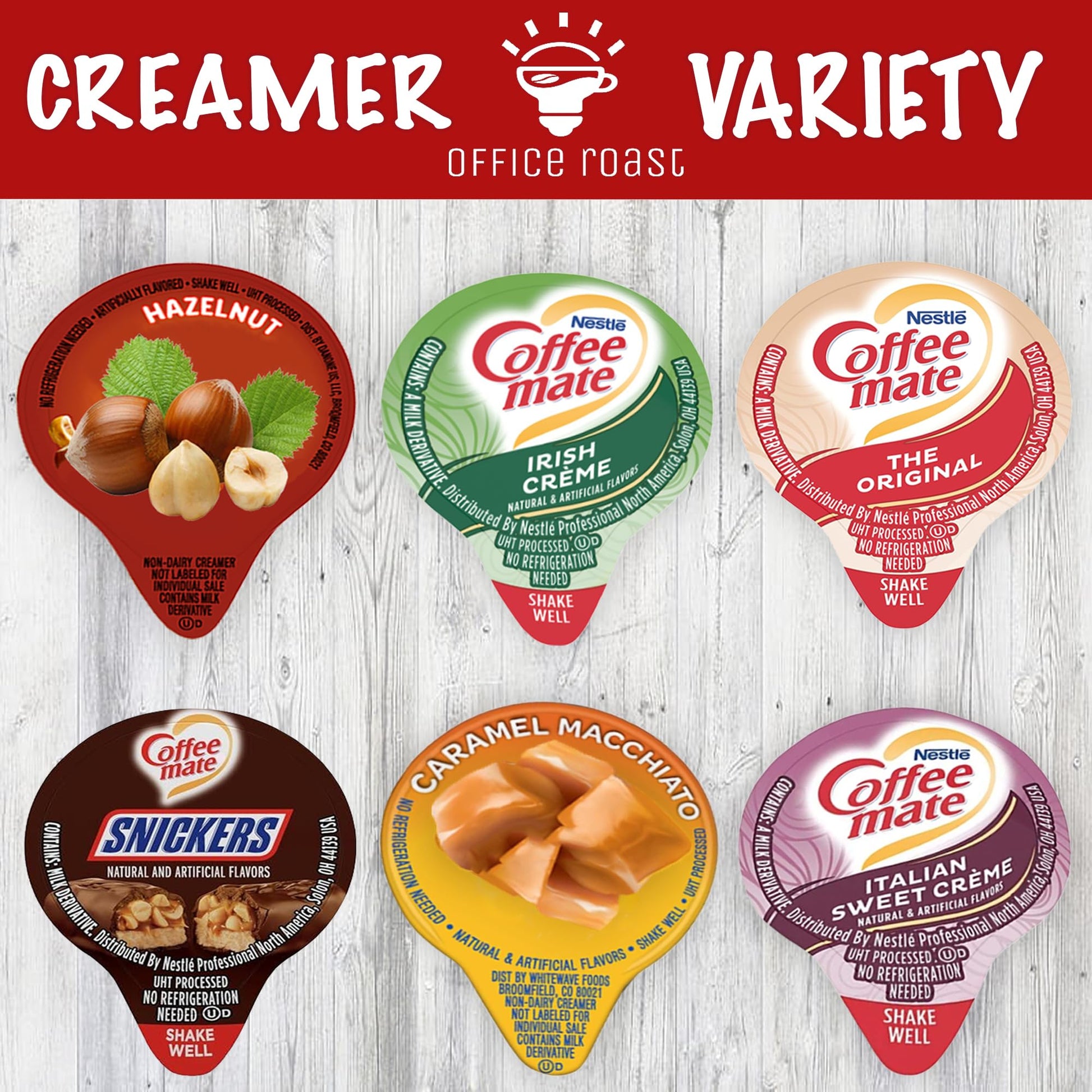 Q: What flavors are included in the Office Roast Variety Pack Creamers?A: The Office Roast Variety Pack Creamers features a delightful assortment of six flavors: Snickers, Italian Sweet, Original, Hazelnut, Irish, and Caramel Macchiato.