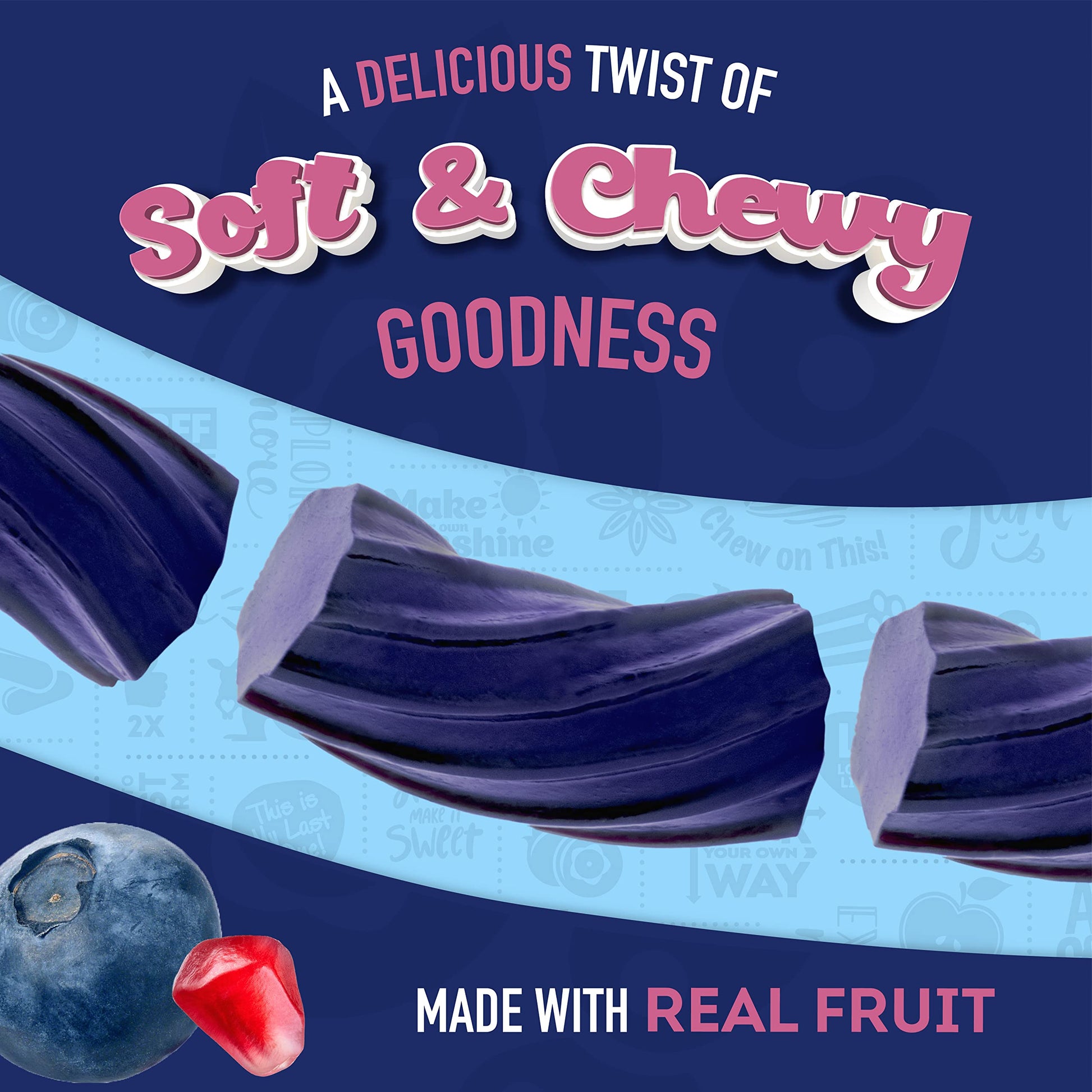 Q: What are the main flavors of Wiley Wallaby Licorice?A: Wiley Wallaby Licorice features bold fruit flavors, specifically Blueberry and Pomegranate, offering a delicious and chewy candy experience.