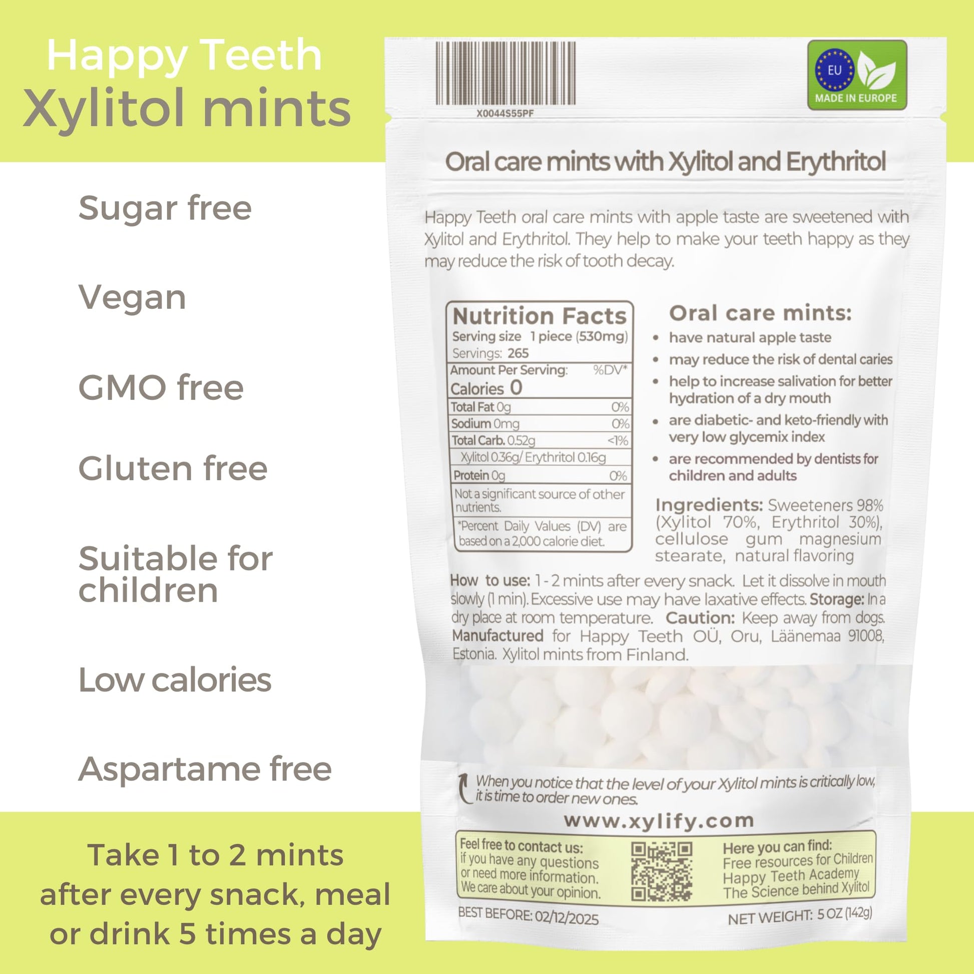 Q: Are Happy Teeth Xylitol Mints suitable for children?A: Yes, Happy Teeth Xylitol Mints are suitable for both children and adults. Dentists often recommend Xylitol as an essential part of daily oral care routines for its effectiveness in promoting dental health.