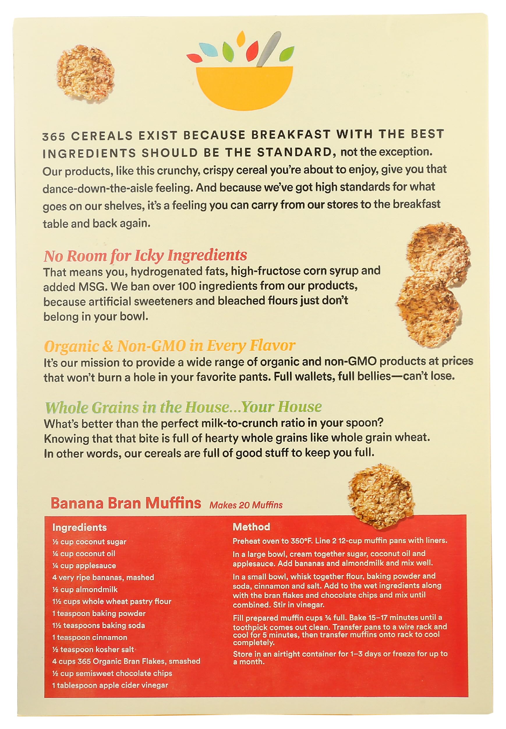 - Quality Ingredients: At 365 by Whole Foods Market, we believe that breakfast should be made with the best ingredients. Our Organic Bran Flakes are crafted without any room for icky ingredients like hydrogenated fats, high-fructose corn syrup, or added MSG.