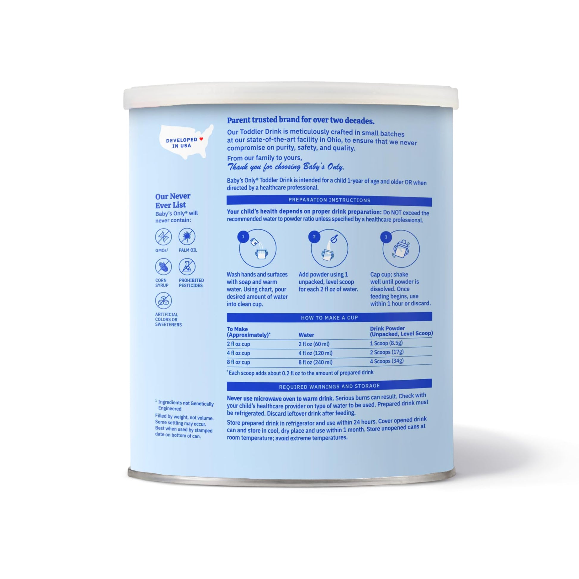 - Q: How do I prepare Baby's Only Organic Sensitive Toddler Drink? A: To prepare the toddler drink, mix one unpacked level scoop of the powder with two fluid ounces of water. Secure the cap on the cup and shake well until the powder is fully dissolved.