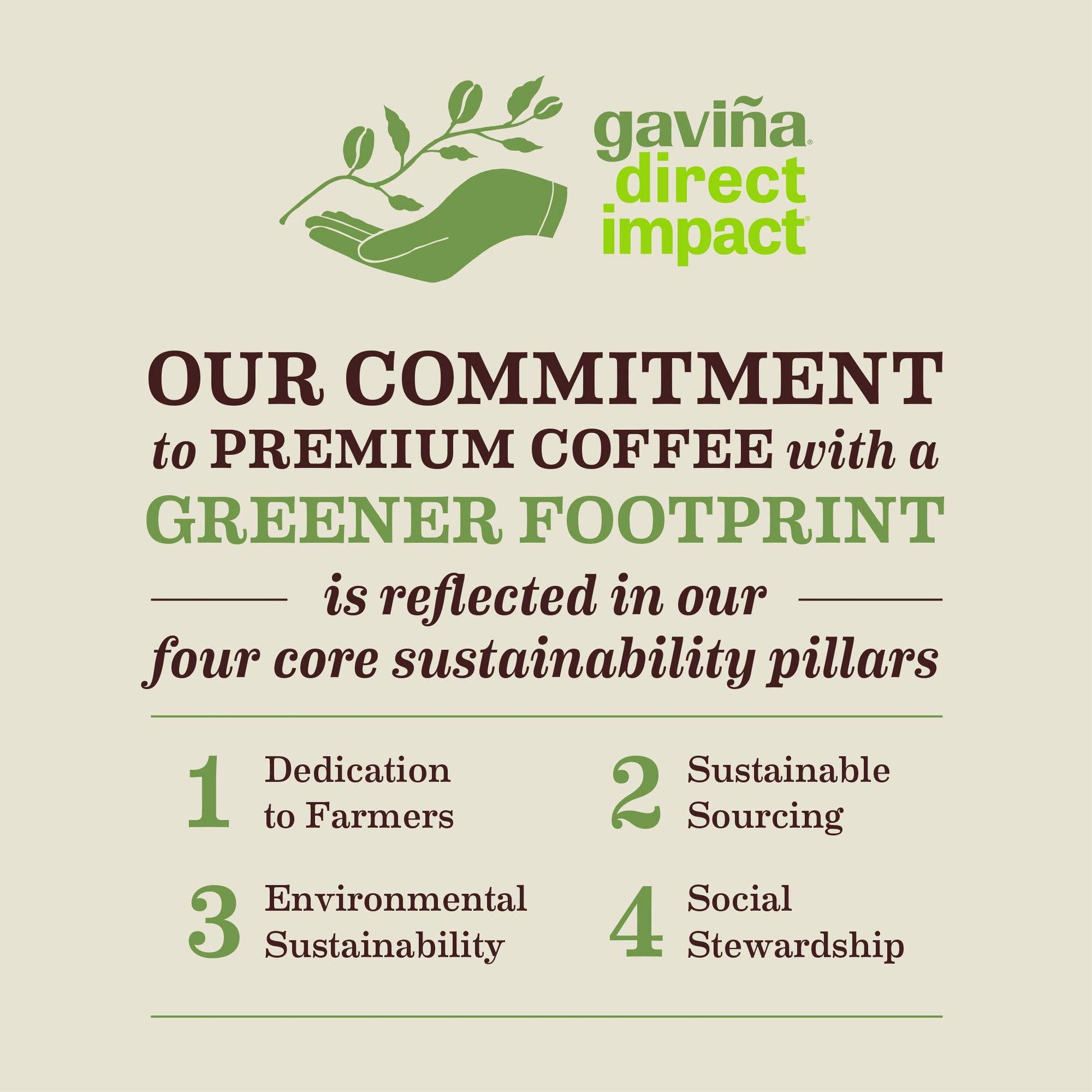 • Q: Is Cafe Gavina Espresso Roast environmentally friendly? A: Yes, Cafe Gavina is committed to sustainability through its Direct Impact Initiative. This initiative influences all business decisions to preserve natural resources and protect the environment, ensuring that future generations can enjoy quality coffee.